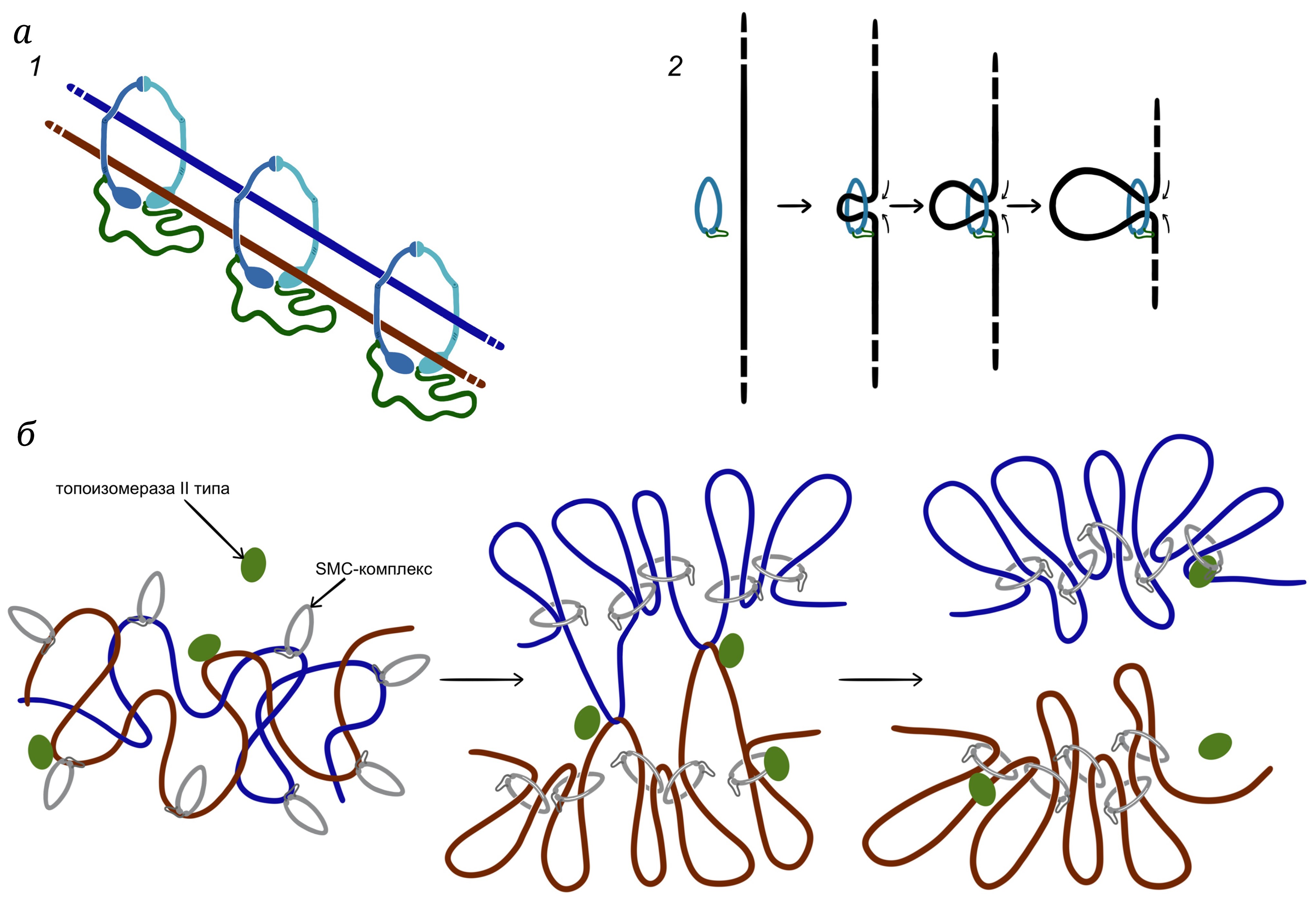 Рис. 1. Когезия сестринских хроматид и экструзия ДНК-петель, осуществляемые SMC-комплексами. а – Две базовые активности когезина: когезия (1) и экструзия (2). б – Экструзия, осуществляемая SMC-комплексами, и активность ДНК-топоизомераз типа II обеспечивают пострепликативную индивидуализацию сестринских геномов во всех клетках, прокариотических и эукариотических