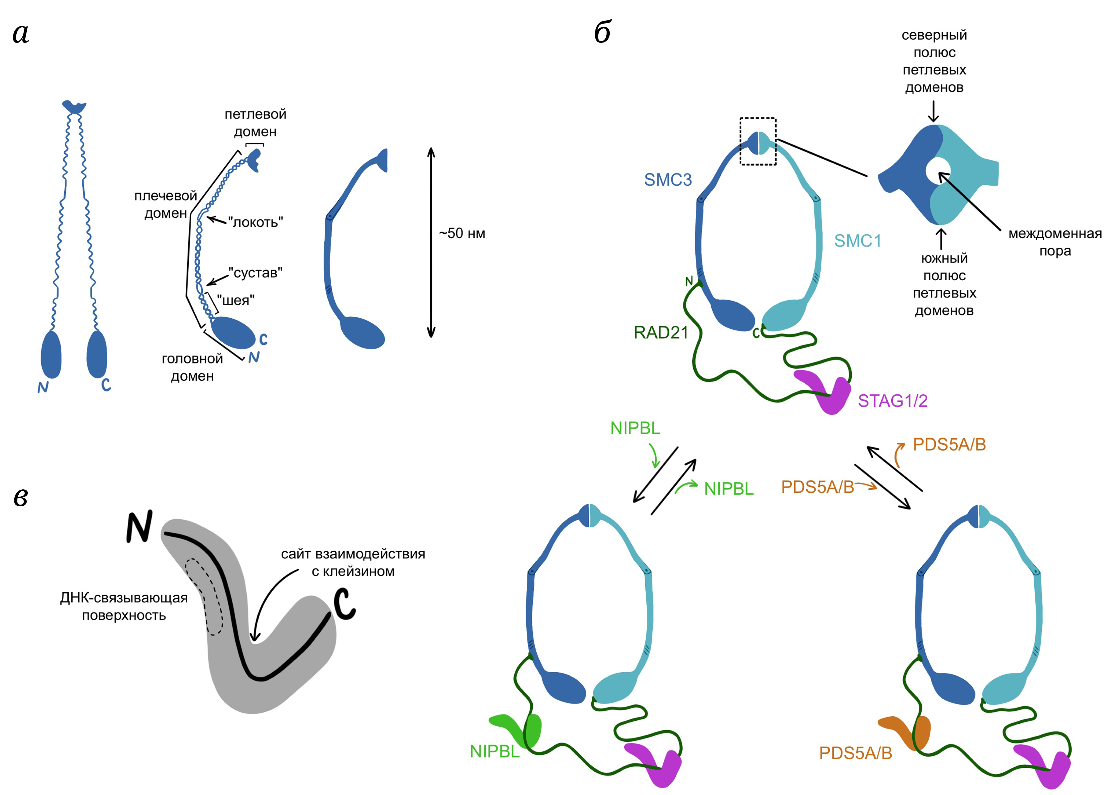RAD21-Клейзиновая субъединица имеет длину порядка 500–700 а.о. с двумя структурированными доменами на N- и C-концах и протяженной, в значительной мере неупорядоченной, областью между ними [13]. N-Концевой домен клейзина взаимодействует с областью сочленения головного и плечевого доменов SMC3-субъединицы, а C-концевой – с головным доменом SMC1 (рис. 2, б) [21].