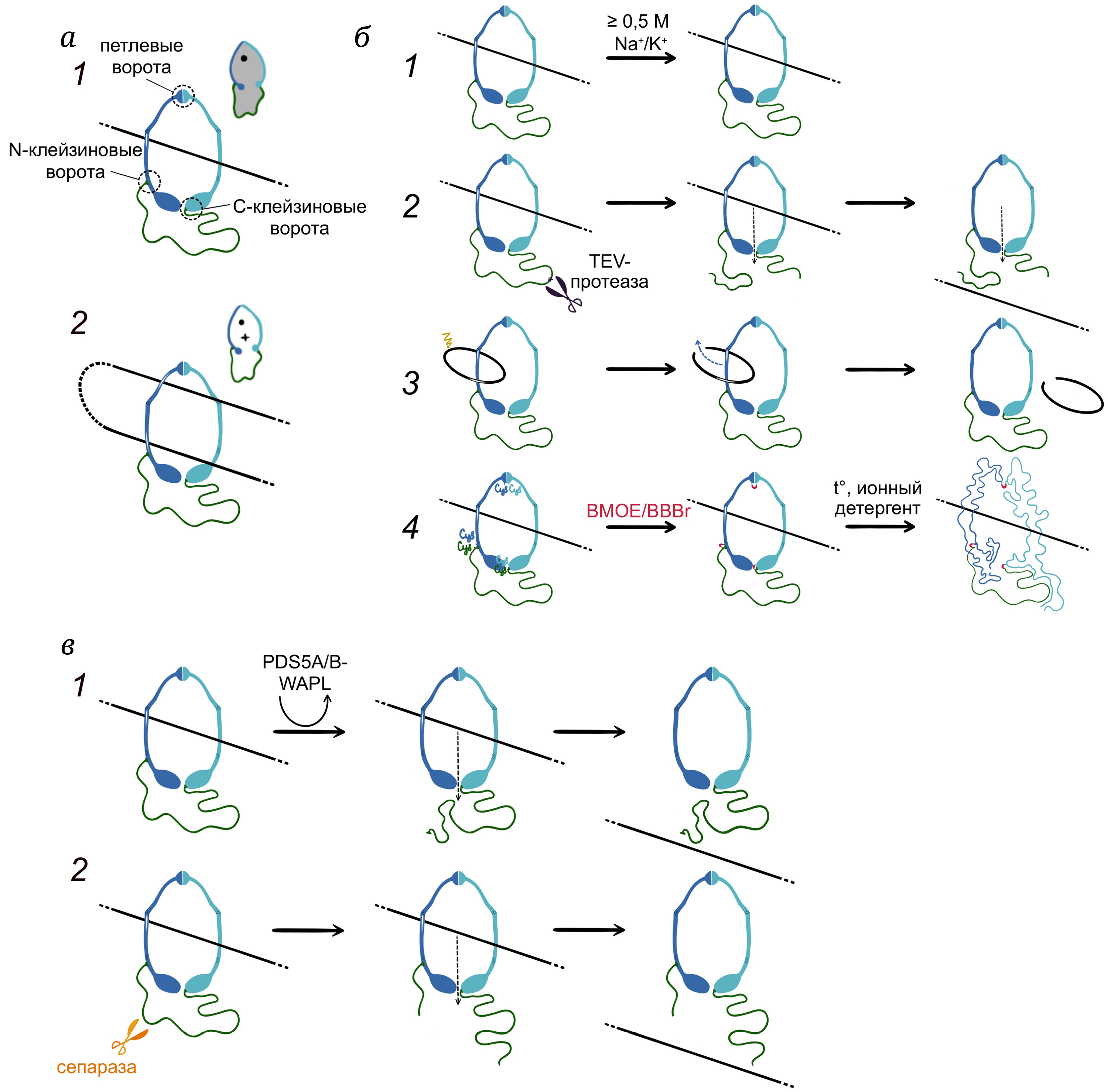 Для понимания физиологической активности когезина чрезвычайно важным является изучение механизмов формирования и терминации топологических взаимодействий S-K-кольца с ДНК. Теоретически такое взаимодействие может устанавливаться и разрушаться при временном разобщении одного из трех нековалентных взаимодействий, формирующих S-K-кольцо: контакта петлевых доменов SMC3 и SMC1 (петлевых ворот), контакта между клейзином и SMC3-субъединицей (N-клейзиновых ворот) или контакта между клейзином и SMC1 (С-клейзиновых ворот) (рис. 4, а (1)). Кроме того, топологическое взаимодействие когезина с ДНК может разрушаться при протеолизе одной из коровых субъединиц комплекса.