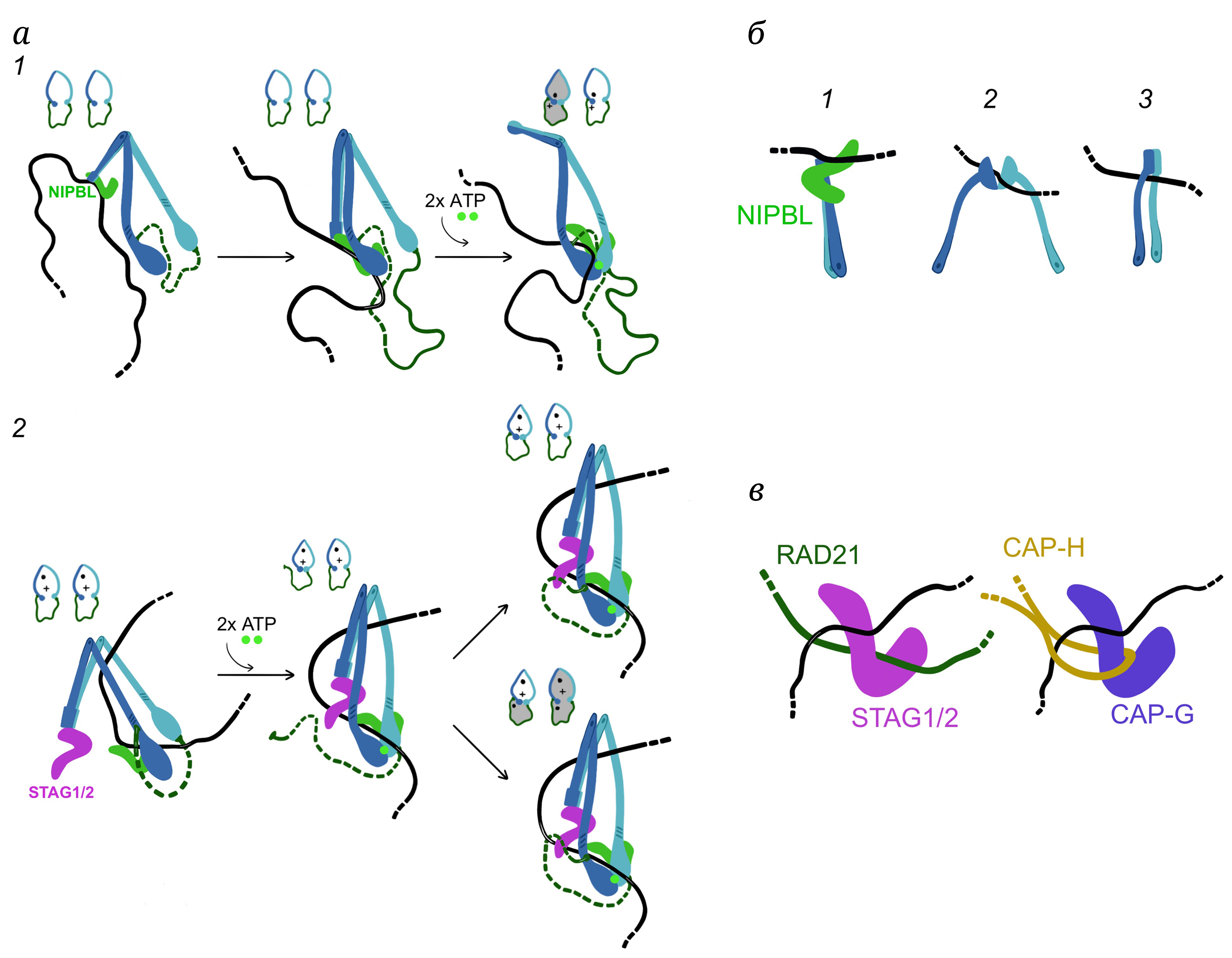 В присутствии ATP, ДНК, NIPBL и когезина дикого типа происходит периодическое сближение головных доменов SMC и NIPBL-субъединицы между собой; при замене ATP на негидролизуемый аналог или при внесении EQ-мутаций это сближение становится конститутивным [49, 50]. Примечательно также, что при связывании ATP ДНК сначала взаимодействует с головным доменом SMC3 и NIPBL-субъединицей в так называемом «предзахвате» (pre-engaged clamp), и только после этого происходит сближение головных доменов между собой с образованием полноценной конфигурации «захвата» (рис. 5, а (1)) [50].