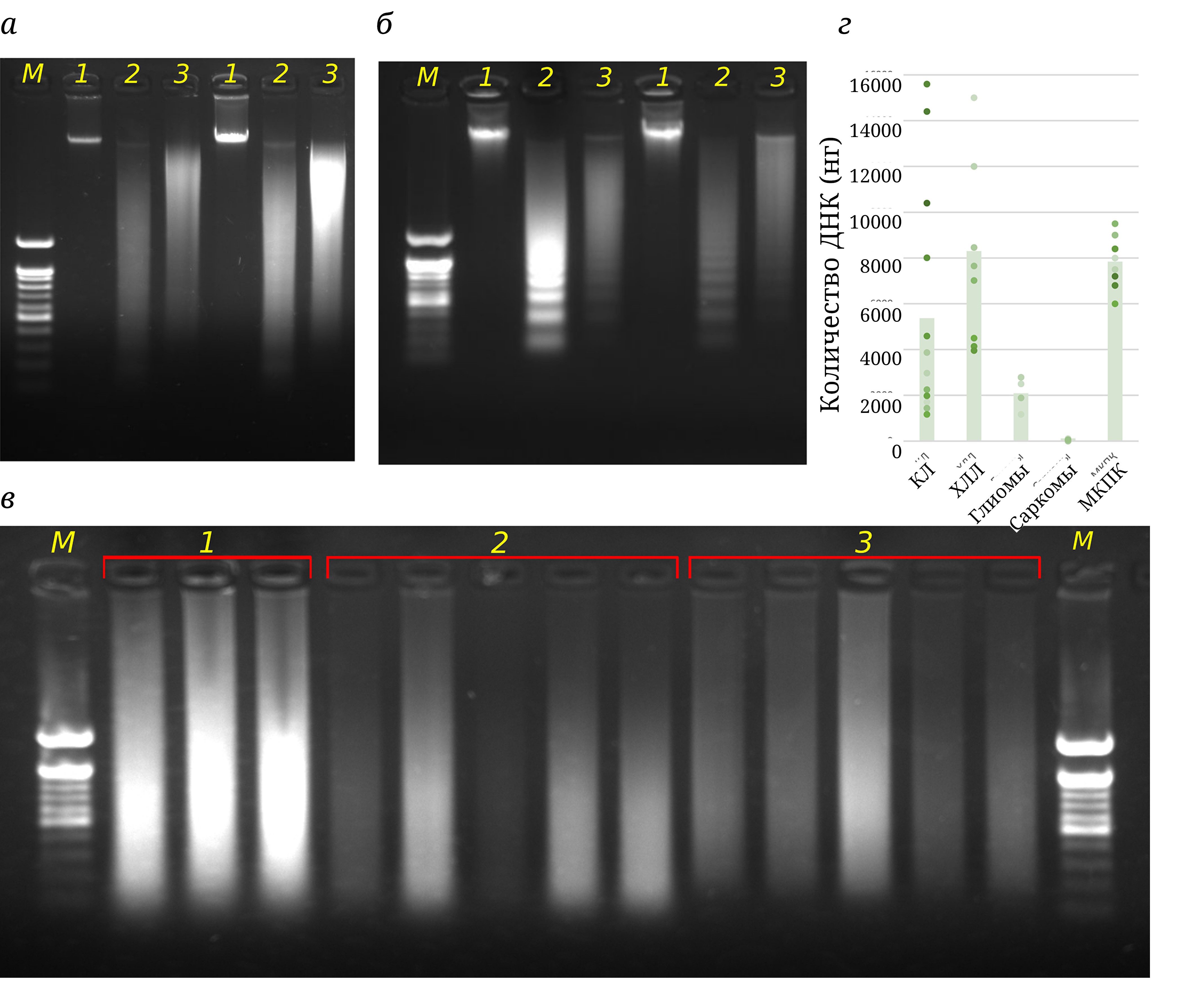 Рис. 1. Контроли этапов фрагментации и лигирования хроматина в Hi-C-экспериментах на свежих клетках и тканях с использованием DpnII (а), S1-нуклеазы (б) или полученные с использованием разработанного протокола Hi-C-анализа FFPE-срезов (в). 1 – Образец до фрагментации, 2 – после фрагментации, 3 – после лигирования. М – маркер длины 100 п.н. («SibEnzyme», М24). г – Количество выделенной ДНК (нг) в Hi-C-библиотеках, полученных из FFPE-срезов разных типов опухоли. Число проанализированных библиотек из мононуклеаров крови (МКПК) – 16, из FFPE-срезов: КЛ – 13, ХЛЛ – 9, глиомы – 4, саркомы – 5