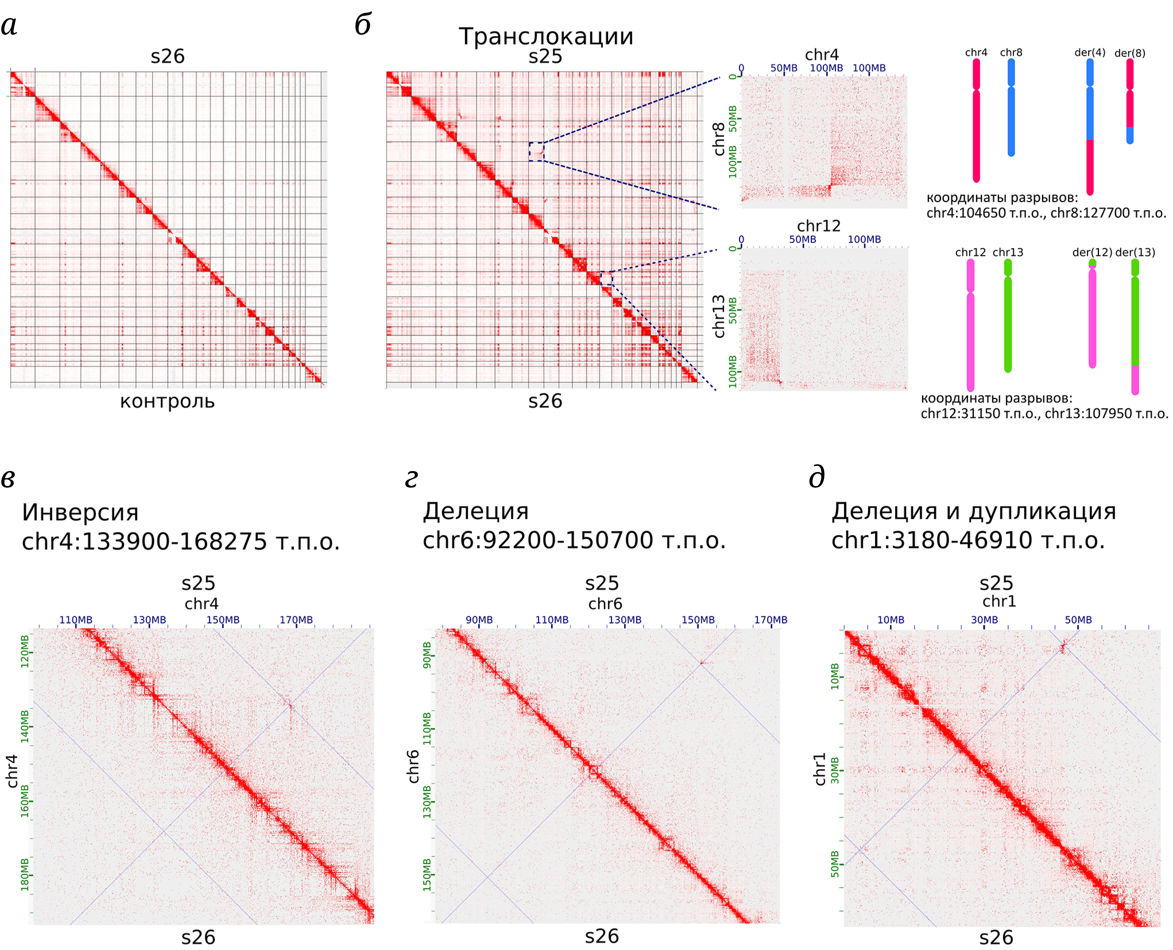 Рис. 3. Тепловые карты контактов для Hi-C из FFPE-срезов. а – Изображение тепловой карты геномных Hi-C-контактов в масштабе хромосом для образца s26 (выше диагонали), в качестве контроля (ниже диагонали) приведена карта, полученная для лимфоцитов крови [30]. б – Примеры паттернов контактов на картах Hi-C, соответствующих реципрокным транслокациям, и их схематичное изображение. Примеры паттернов контактов на картах Hi-C для: инверсии (в), гетерозиготной делеции (г), гетерозиготных делеции и дупликации (д). Выше диагонали – карта контактов для образца s25, ниже – s26, который использовали в качестве контроля