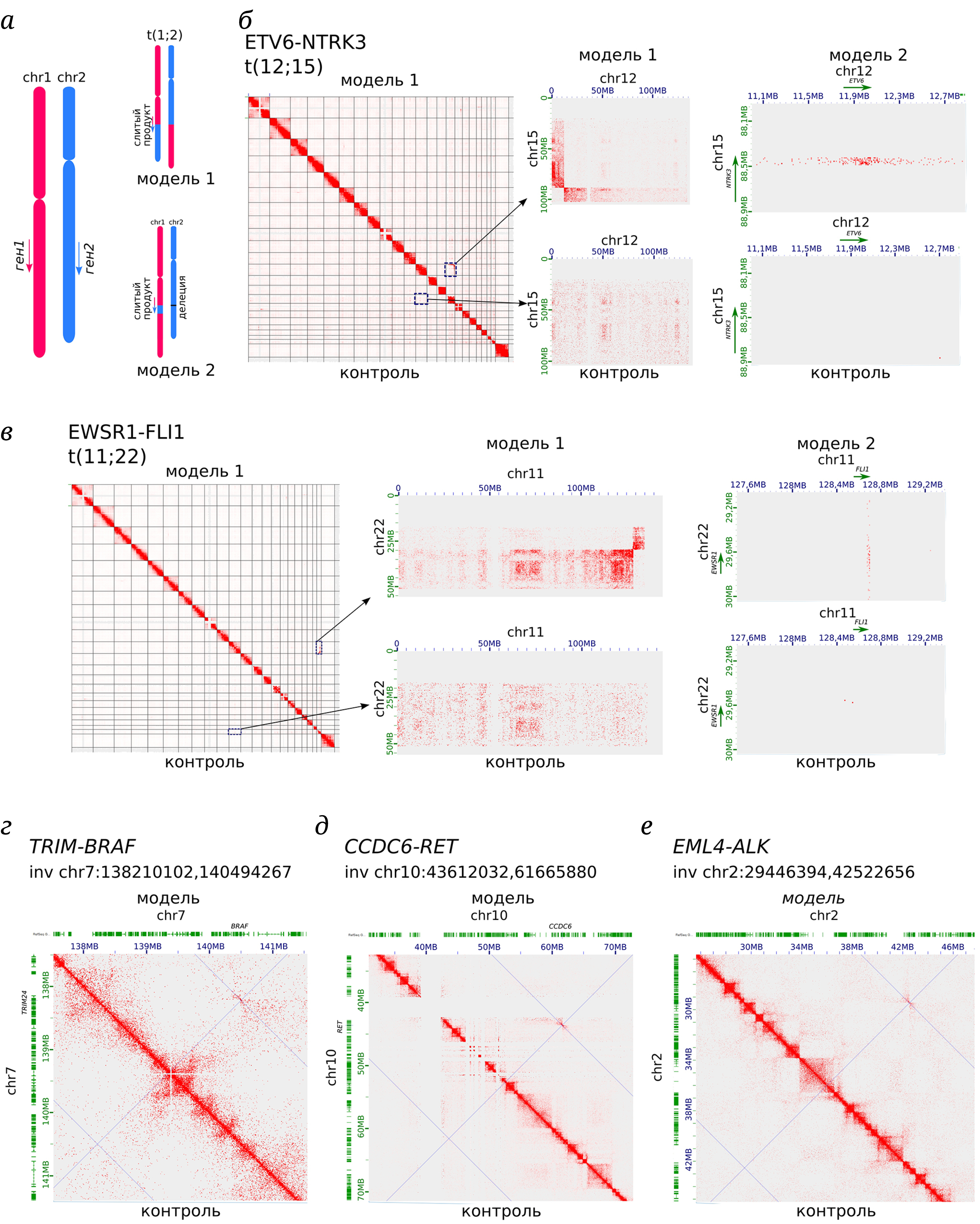 Рис. 4. Моделирование хромосомных перестроек. а – Схематичное изображение двух вариантов транслокации, приводящей к слиянию генов. б, в – Тепловые карты контактов, построенные на основании смоделированных данных Hi-C для транслокаций. г–е – Тепловые карты контактов, построенные на основании смоделированных данных Hi-C для инверсий. Выше диагонали – карта контактов для смоделированной перестройки, ниже – контроль. В качестве контроля выступает модель Hi-C-карты без перестроек с таким же количеством контактов, как и у модели с перестройками