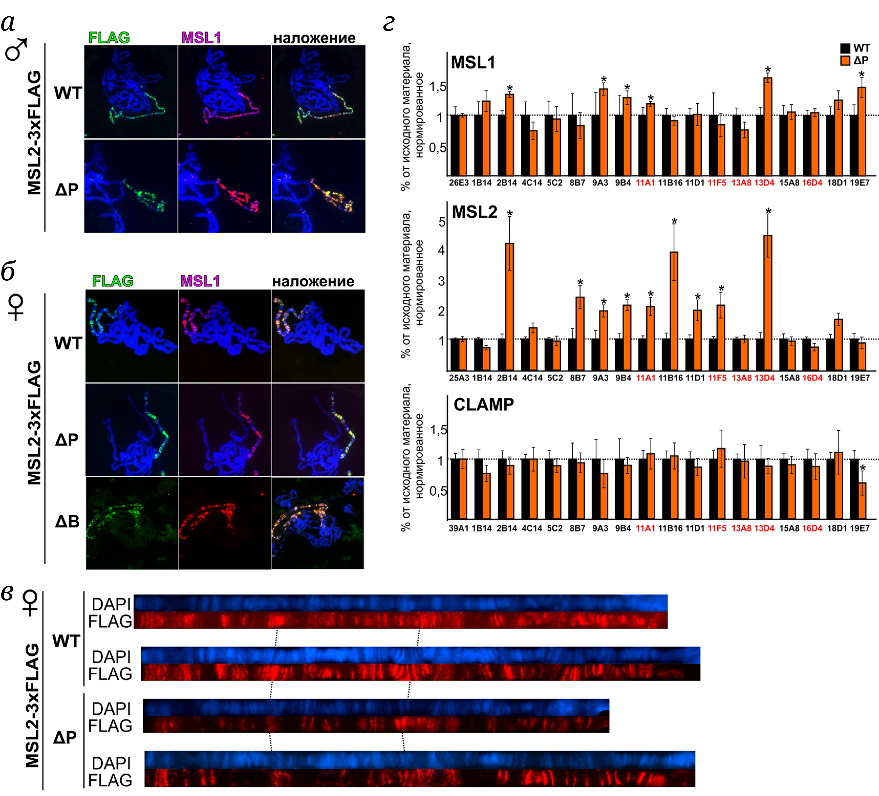 Рис. 3. Анализ связывания КДК с хроматином в трансгенных линиях мух. а – Сравнение связывания MSL1 и MSL2 c политенными хромосомами личинок самцов msl2γ227, экспрессирующих различные варианты MSL2 (MSL2WT, MSL2ΔP). б – Сравнение связывания MSL1 и MSL2 c политенными хромосомами личинок самок, гетерозиготных по трансгену, экспрессирующему один из вариантов MSL2 (MSL2WT, MSL2ΔP, MSL2ΔB). На фотографиях показано иммунное окрашивание с мышиными анти-FLAG-антителами (MSL2, зеленый) и кроличьими анти-MSL1-антителами (красный). Окрашивание ДНК – DAPI (синий). в – Сравнение распределения белка MSL2 вдоль политенной Х-хромосомы у самок, гетерозиготных по трансгену, экспрессирующему один из вариантов MSL2 (MSL2WT, MSL2ΔP). Показаны по два независимых окрашивания; окрашивание MSL2 – мышиные анти-FLAG-антитела (красный), ДНК – DAPI (синий). г – Сравнение связывания белков MSL1, MSL2 и CLAMP на СПП у самцов, экспрессирующих варианты MSL2 (WT и ΔP) на фоне msl2γ227. Красными буквами отмечены участки, с которыми MSL2 способен связываться напрямую, согласно данным Villa et al. [23]. Результаты представлены в процентах обогащения ДНК после иммунопреципитации к исходной ДНК (% от исходного материала), нормированных относительно соответствующих положительных контрольных участков связывания MSL1 (26E3), MSL2 (25A3) и CLAMP (39A1) на аутосомах. На гистограммах показано сравнение уровня связывания белка MSL2ΔP с уровнем связывания MSL2WT (на шкале приведен к «1»). Усы показывают стандартные отклонения для трех независимых экспериментов; * p < 0,05