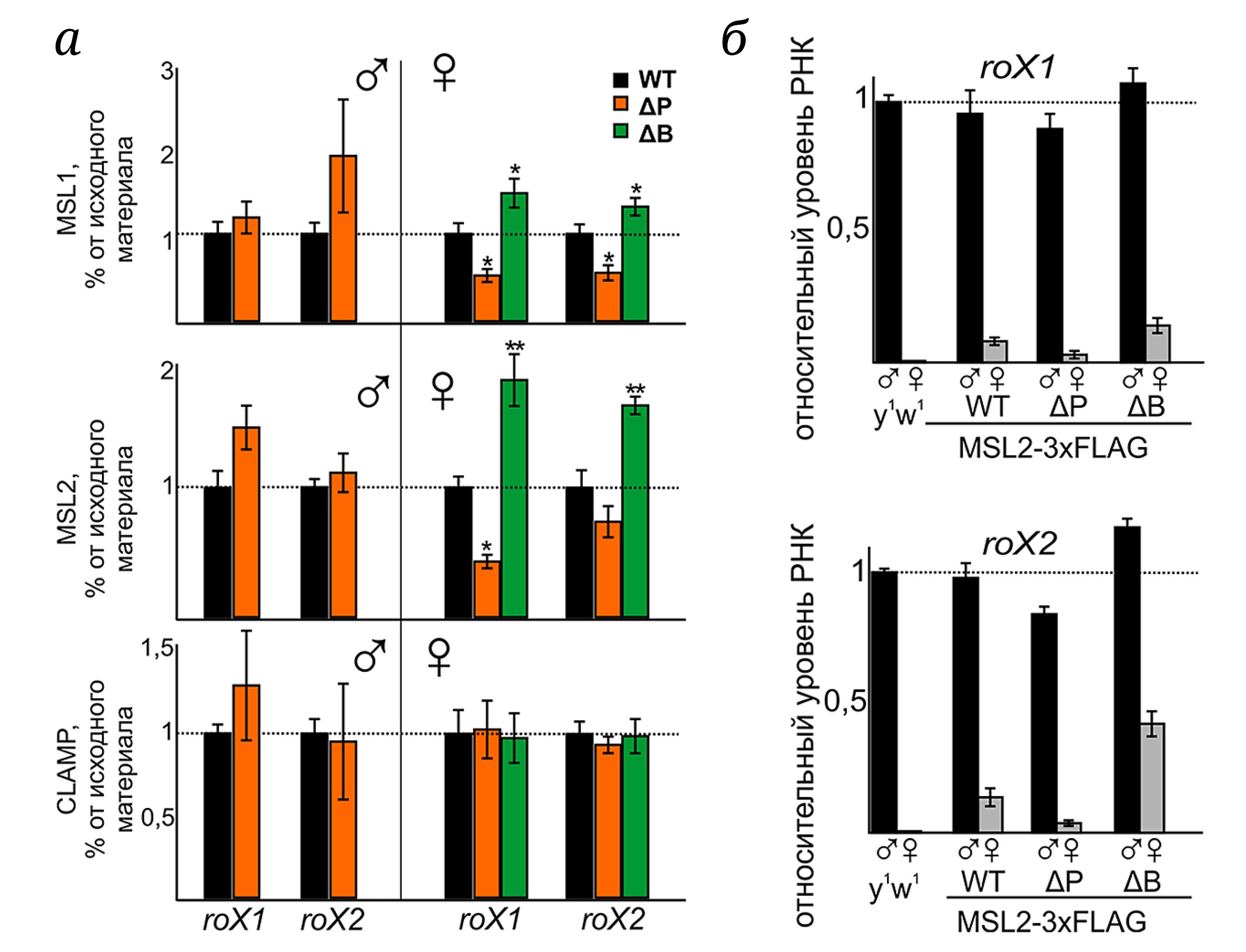 Рис. 4. Сравнение roX1 и roX2 у самок, экспрессирующих MSL2WT, MSL2ΔP, MSL2ΔB. а – Сравнение связывания белков MSL1, MSL2, CLAMP в линиях, экспрессирующих MSL2WT, MSL2ΔB MSL2ΔP, в районах генов roX1 и roX2; * p < 0,05; ** p < 0,01. б – Уровни экспрессии РНК roX1 и roX2 в личинках самцов и самок мух линии y1w1118 (дикого типа) и мух, экспрессирующих MSL2WT, MSL2ΔP, MSL2ΔB, на фоне нуль-мутации msl2γ227. Гистограммы показывают изменение уровня мРНК тестируемых генов roX в линиях, экспрессирующих MSL2WT, MSL2ΔP, MSL2ΔB, по сравнению с уровнем экспрессии у самцов линии y1w1118 (соответствует отметке «1» на шкале). Усы показывают стандартные отклонения по трем независимым измерениям; * p < 0,05