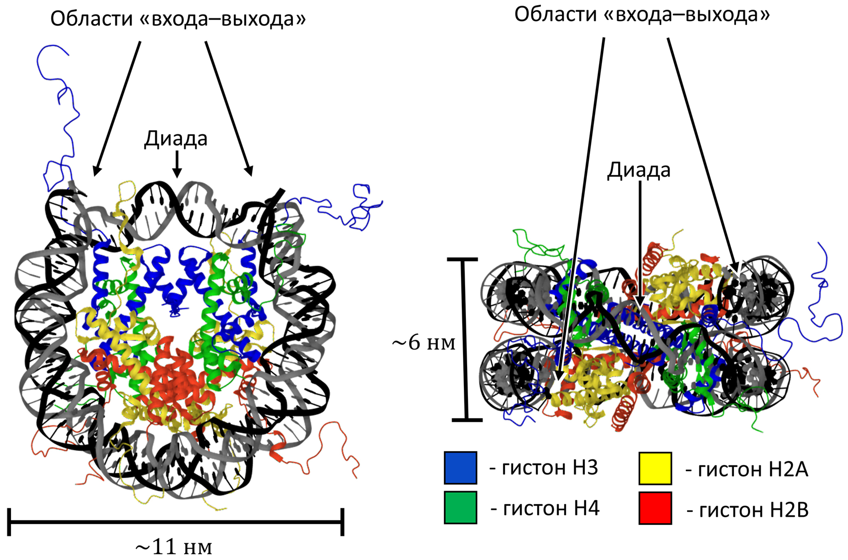 Молекулы ДНК используются клетками для хранения и реализации генетической информации. В клетках эукариот ДНК преимущественно находится в составе хроматина, при этом важное значение имеет как степень компактизации хроматина, так и его пространственная укладка [1]. Базовым уровнем компактизации ДНК является нуклеосома – комплекс, состоящий из восьми гистонов и 147 п.н. ДНК, структура которого во многом определяет свойства хроматина. Первые представления о структуре нуклеосомы были сформулированы в середине 70-х гг. XX века [2–4]. Схематичное представление нуклеосомы приведено на рис. 1.