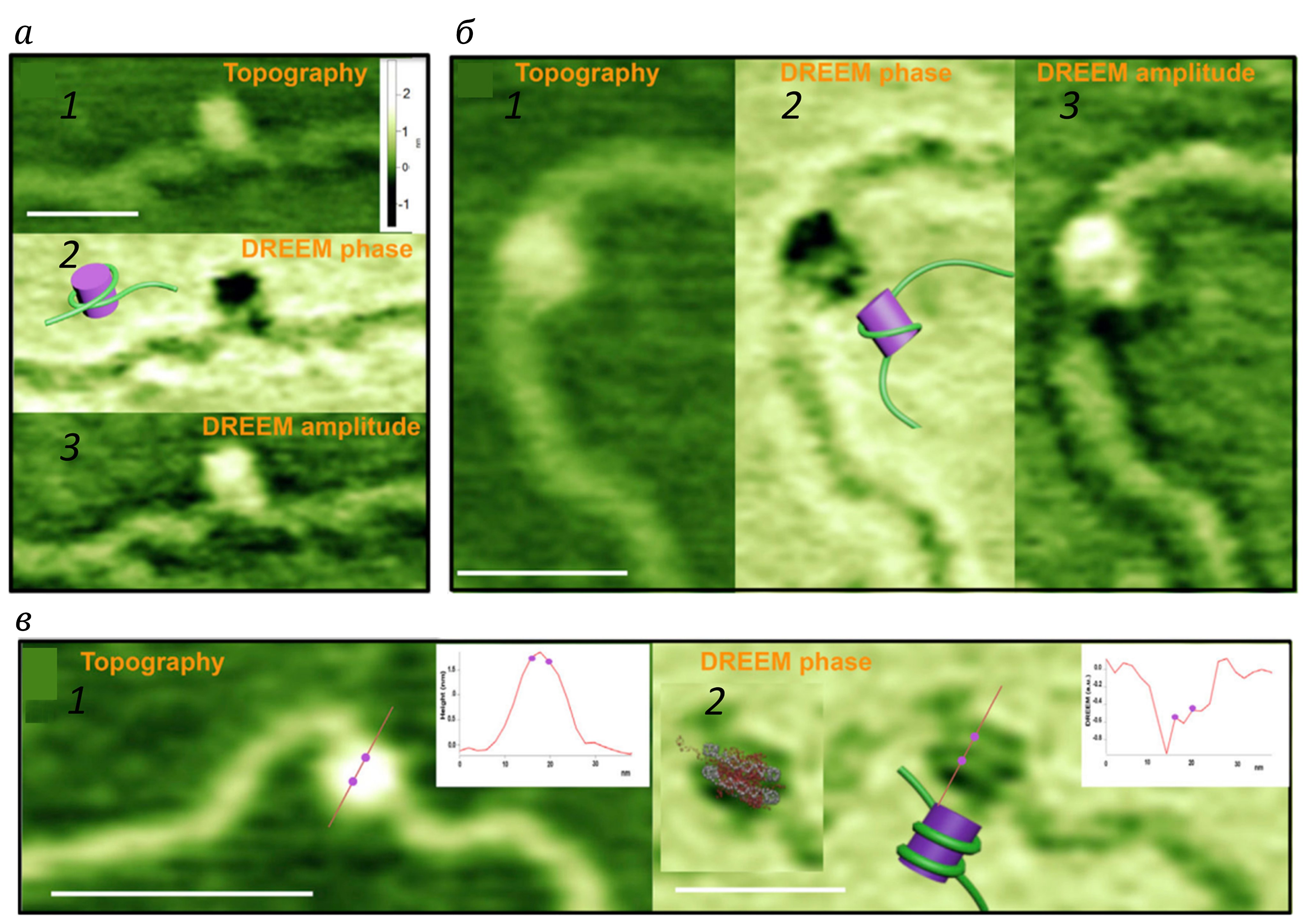 Рис. 5. Топографические изображения нуклеосом с помощью АСМ и DREEM [39]. Топографические (а, 1; б, 1), изображения фазы DREEM (а, 2; б, 2) и амплитуды DREEM (а, 3; б, 3) нуклеосом, показывающие, как молекула ДНК оборачивается вокруг гистонов один раз. в – Топографические (1) и DREEM-фазовые изображения нуклеосомы (2), показывающие, что ДНК дважды оборачивается вокруг нуклеосомы. На вставках показаны профили высоты вдоль линии, проведенной через нуклеосому на топографических (в, 1) и DREEM изображениях (в, 2). Две точки на графиках соответствуют положениям двух точек, показанных на линии, которые отмечают положение пиков, соответствующих ДНК на изображении DREEM. Схематичные модели ДНК, обертывающей гистоны, показаны на каждом изображении DREEM (модели не в масштабе). Кристаллическая структура нуклеосомы, наложенная на изображение DREEM-фазы, показана на вставке к фазовому изображению на панели (в, 2)