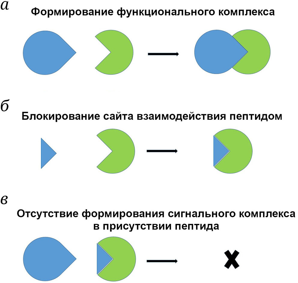 Рис. 1. Механизм действия блокирующих пептидов – предотвращение формирования белкового комплекса за счёт конкуренции с белком-прототипом за функциональный сайт связывания. а – Взаимодействие ДВБ1 (голубая фигура) и ДВБ2 (зелёный сектор) приводит к формированию функционального бинарного комплекса. б – Пептид, соответствующий сайту связывания ДВБ1 с ДВБ2, (голубой треугольник) сохраняет способность связываться с ДВБ2. в – Связывание пептида с ДВБ2 предотвращает формирование комплекса ДВБ1–ДВБ2