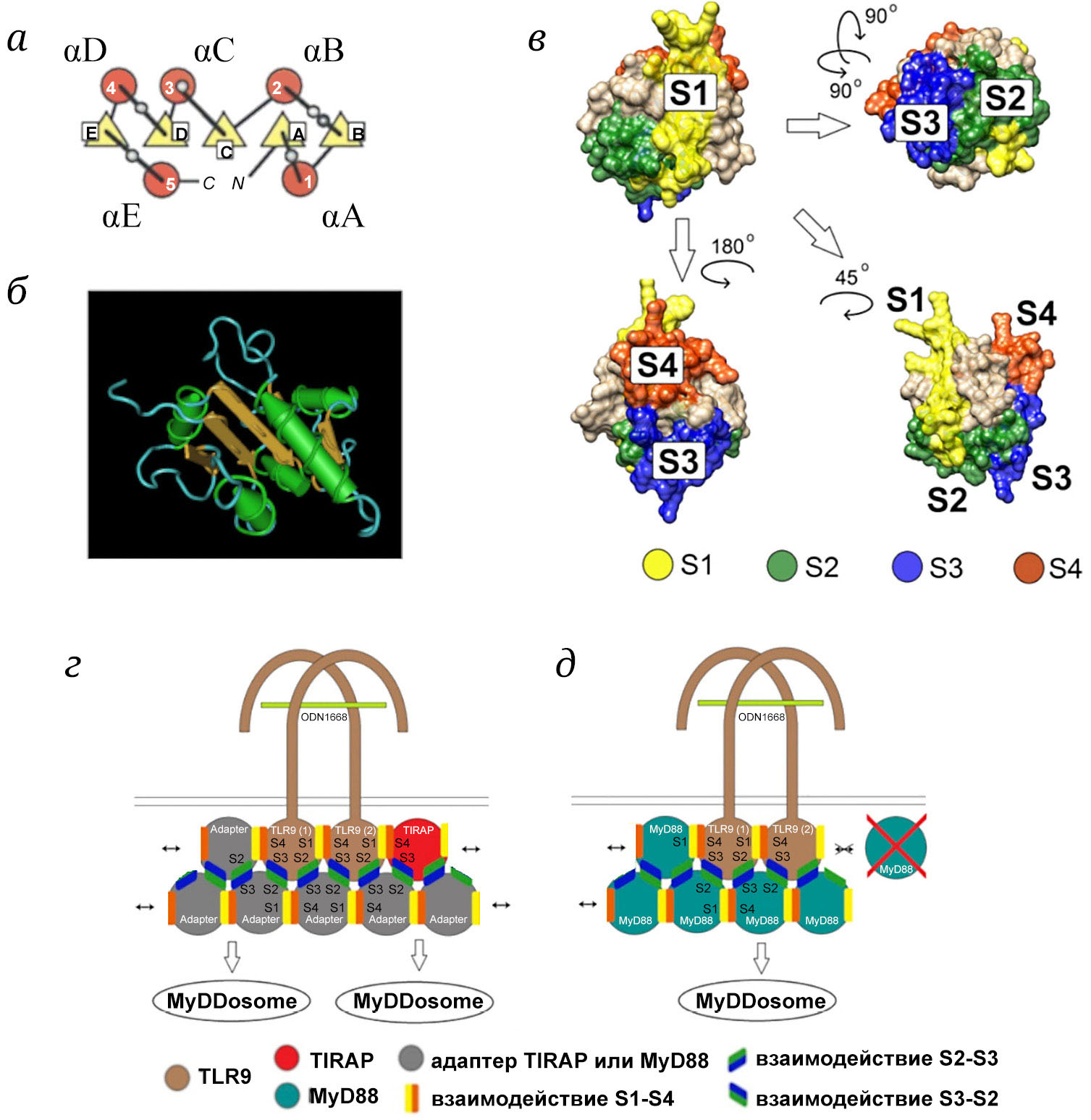 Рис. 2. Структура TIR-доменов, позиции участков, соответствующих ингибиторным БП, и предполагаемая архитектура комплексов, образуемых TIR-доменами при активации TLR. а – Схема, показывающая вторичную структуру TIR-доменов [84]. TIR-Домены принадлежат к классу α/β белковых доменов, вторичная структура которых образована β-тяжами, чередующимися с α-спиральными участками [84]. Согласно наиболее часто используемой номенклатуре, элементы вторичной структуры TIR-доменов обозначаются в алфавитном порядке, начиная с N-конца. Например, βА и βЕ (показаны на панели (а) треугольниками) обозначают первый и пятый тяжи, а αB и αД – вторую и четвёртую спирали (показаны на схеме коричневыми кружками). Петли обозначаются двумя заглавными буквами соответственно элементам, которые они соединяют. Например, петля ВВ соединяет второй тяж со второй спиралью, а петля ДЕ – четвёртую спираль с пятым тяжом. б – Третичная структура TIR-домена TLR2 человека [85]. Типичный TIR-домен включает в себя 5 тяжей, уложенных в параллельный β-лист, формирующий сердцевину домена. α-Спирали располагаются по обе стороны листа – первая и последняя располагаются с вогнутой стороны листа; вторая, третья и четвёртая располагаются на его выпуклой стороне. в – 4 сайта связывания TIR-доменов, осуществляющие димеризацию TIR-доменов рецепторов и рекрутирование адаптерных белков, обозначены на рисунке как S1–S4. Сайты S1 и S4 расположены на противоположных концах TIR-домена, в районах краевых тяжей β-листа. Сайты S2 и S3 располагаются в одной полусфере. Сайт S2 формируется спиралями B и/или С; сайт S3 – спиралью D вместе с прилегающими петлями [26, 83]. г – Схема взаимодействия TIR-доменов в формирующемся сигнальном комплексе при активации TLR9 в присутствии обоих адаптеров MyD88-зависимого пути, TIRAP и MyD88. Сайты S1 и S4, реципрокно взаимодействуя, образуют связи внутри каждой из цепей двуцепочечной структуры комплекса, тогда как сайты S2 и S3 формируют межцепочечные связи [83]. д – Схема взаимодействия TIR-доменов в сигнальном комплексе при активации TLR9 при отсутствии TIRAP [83]