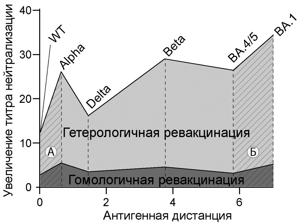 Рис. 3. Пример графика увеличения широты нейтрализации при гомо- и гетерологичной ревакцинации, адаптировано из работы Astakhova et al. [37]