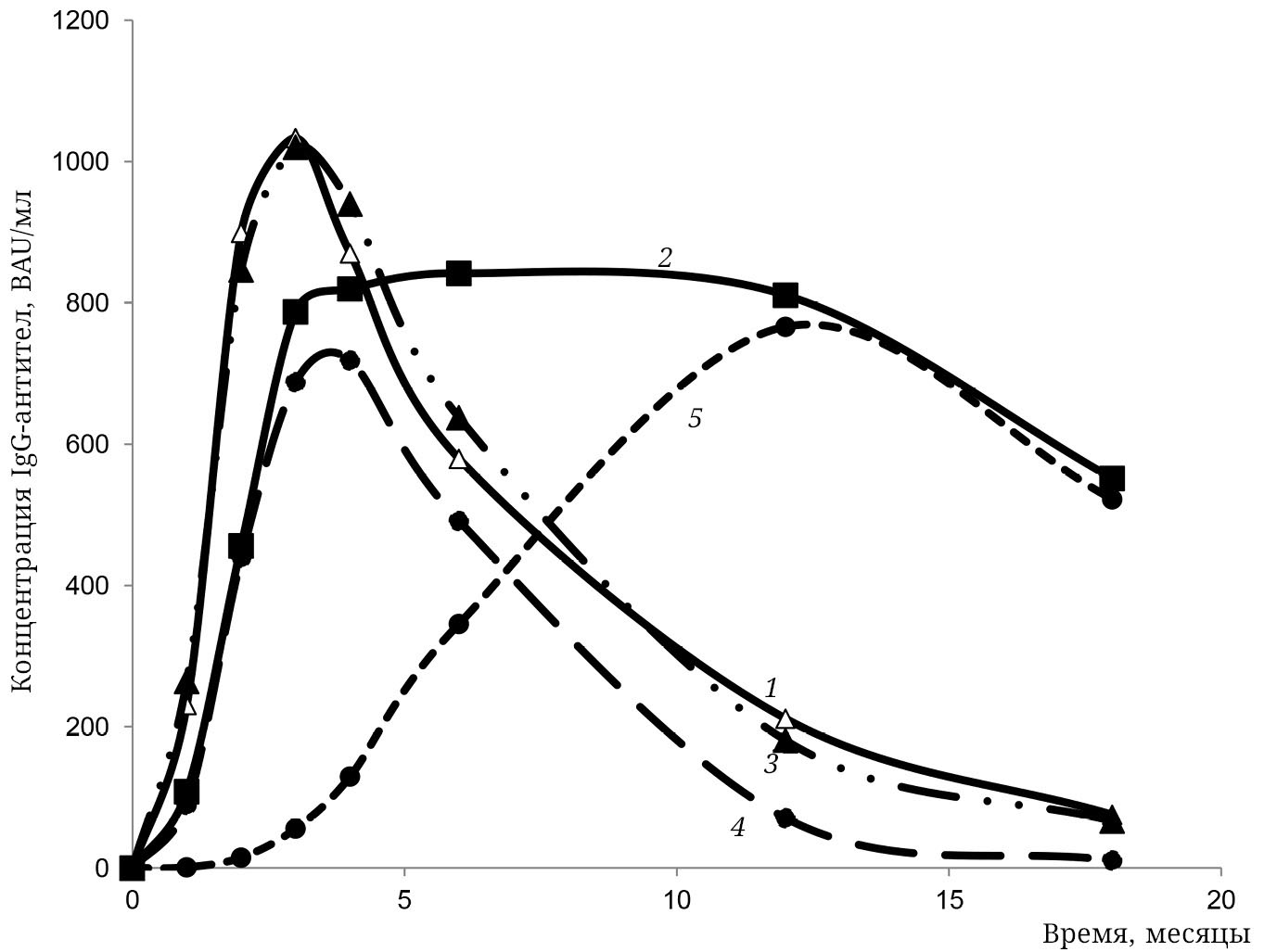 Рис. 1. Уровень IgG-антител к антигенам вируса SARS-CoV-2. Кривые: 1 – IgG-антитела к N-белку вируса SARS-CoV-2 (экспериментальные данные); 2 – IgG-антитела к S-белку вируса SARS-CoV-2 (экспериментальные данные); 3 – аппроксимация Фишера уровня IgG-антител к N-белку вируса SARS-CoV-2 (короткоживущие плазмоциты); 4 – аппроксимация Фишера уровня IgG-антител к S-белку вируса SARS-CoV-2 (короткоживущие плазмоциты); 5 – аппроксимация Эрланга уровня IgG-антител к S-белку вируса SARS-CoV-2 (долгоживущие плазмоциты)