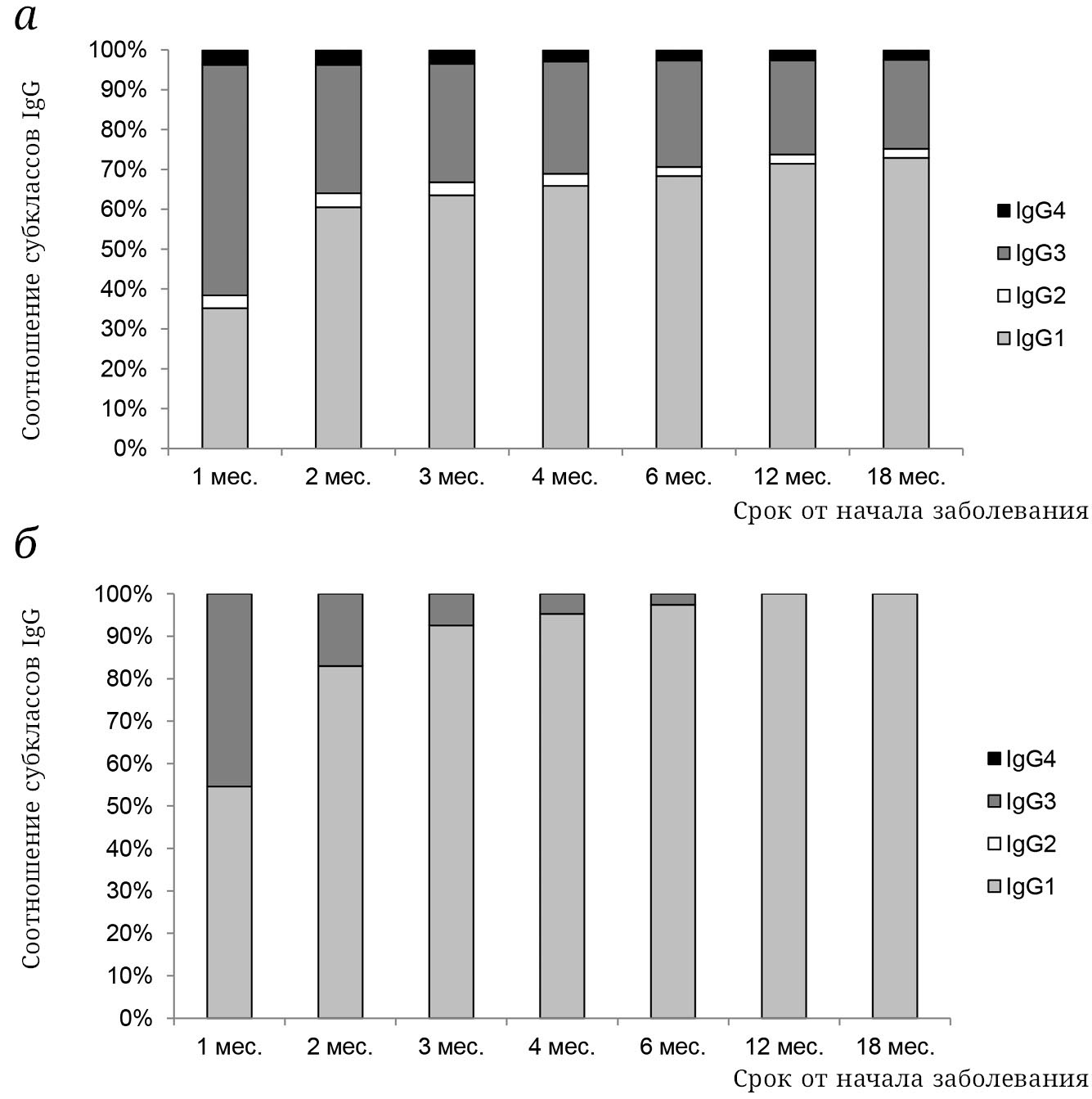 Рис. 2. Динамика спектра субклассов IgG-антител к антигенам вируса SARS-CoV-2. а – N-белок вируса SARS-CoV-2; б – S-белок вируса SARS-CoV-2