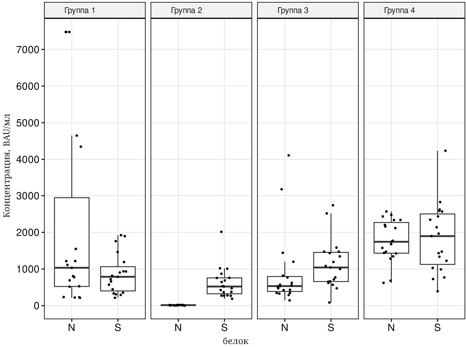 Рис. 3. Сопоставление уровней IgG-антител к N- и S-белку у переболевших COVID-19 (группа 1), дважды привитых «Спутник V» (группа 2), переболевших, а после привитых «Спутник V» (группа 3) и дважды переболевших COVID-19 (группа 4)