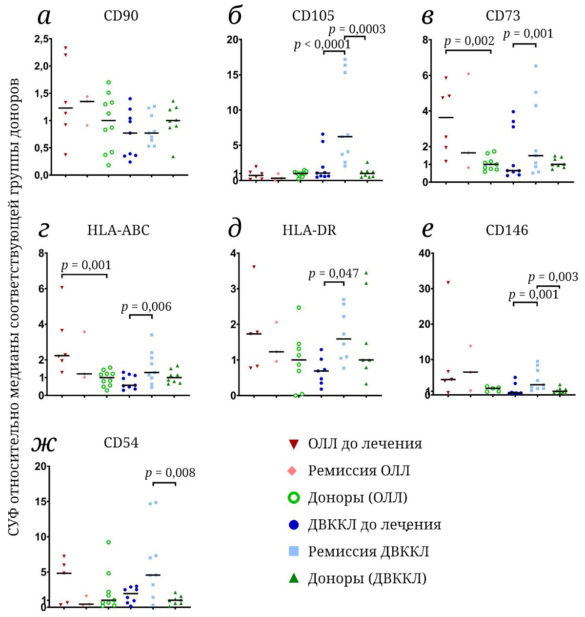 Работа выполнена на МСК, выделенных из костного мозга пациентов с ОЛЛ и ДВККЛ, в качестве контроля были использованы МСК из костного мозга здоровых доноров. Чтобы учесть разницу в возрасте, для пациентов с ОЛЛ и ДBККЛ были подобраны две разные группы доноров соответствующего возраста. В связи с этим исследованные показатели были нормированы на значение медианы соответствующей группы доноров.