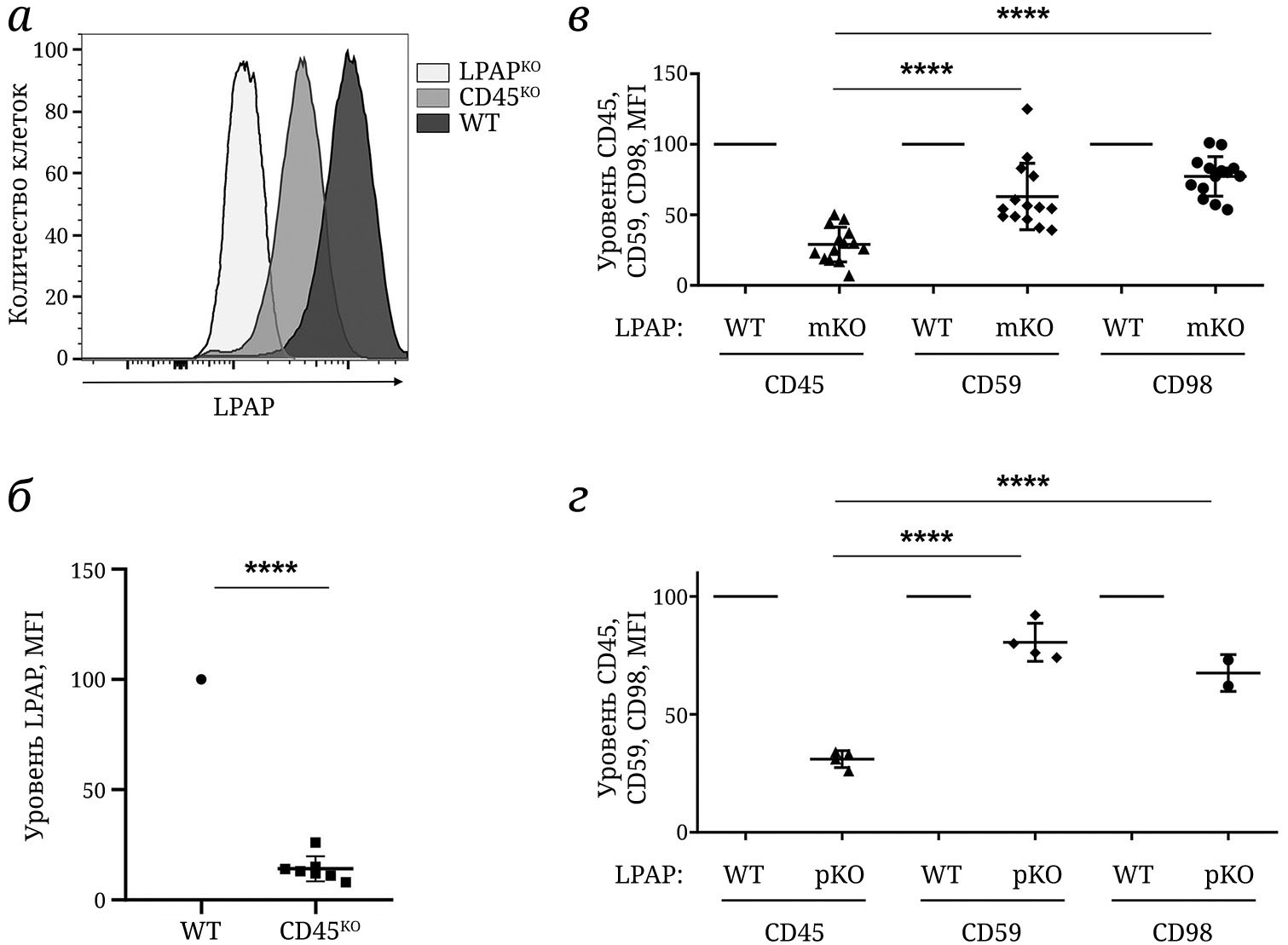 Рис. 1. Уровень белков LPAP и CD45 падает в отсутствии белка-партнёра. а – Репрезентативные цитограммы экспрессии LPAP на клетках Jurkat дикого типа (WT), а также на клетках CD45KO или LPAPKO; б – экспрессия LPAP по результатам тестирования 7 клонов CD45KO; в, г – экспрессия CD45 и «посторонних» белков CD59 и CD98 в культурах Jurkat LPAPmKО (в) или в LPAPpKO (г). Уровни экспрессии белков LPAP, CD45, CD59 и CD98 определяли с помощью проточной цитометрии. Нормализованный уровень экспрессии CD45 сравнивали с контрольным значением 100 с помощью одновыборочного t-критерия Стьюдента (б). Для сравнения уровня белков в клетках дикого типа и нокаутных использовали метод ANOVA с post hoc анализом с помощью теста Тьюки (в, г), **** p < 0,0001