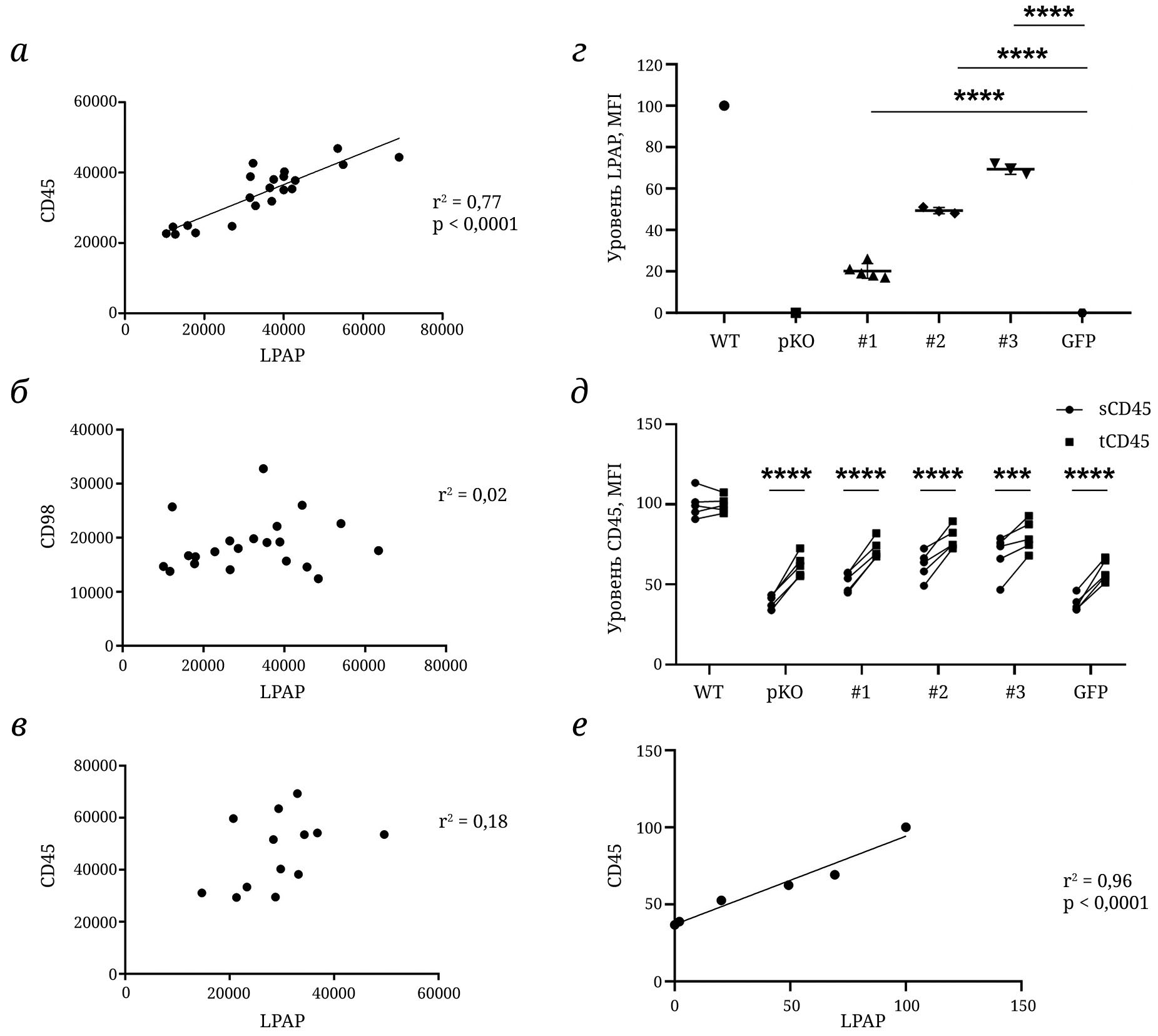 Рис. 2. Уровень CD45 коррелирует с уровнем белка LPAP. а, б – Корреляция между уровнями LPAP и CD45 (а) или LPAP и CD98 (б) в клонах Jurkat LPAPKO с реэкспрессией LPAPWT; в – корреляция между уровнями LPAP и CD45 в клонах Jurkat LPAPWT; г, д – уровень LPAP (г) и CD45 (д) на клетках Jurkat LPAPpKO, стабильно трансдуцированных возрастающей дозой вируса для реэкспрессии LPAPWT (#1, #2, #3) или экспрессии GFP. Экспрессия LPAP нормирована относительно клеток Jurkat LPAPWT. Для CD45 показаны значения для поверхностного (sCD45) и общего (tCD45) уровня; е – корреляция между уровнями LPAP и CD45 в клонах Jurkat LPAPKO, стабильно трансфицированных LPAPWT. Уровни экспрессии определяли по значениям MFI, которые были нормализованы относительно среднего значения для Jurkat WT после вычитания фонового уровня в клетках Jurkat CD45KO или Jurkat LPAPKO. Приведены индивидуальные значения, а также среднее ± SD. Нормализованный уровень экспрессии LPAP в трансдуцированных клетках сравнивали со значением ноль в клетках, экспрессирующих GFP, с помощью одновыборочного t-критерия Стьюдента (г). Для сравнения уровня поверхностного (s) и общего (t) CD45 в клетках Jurkat LPAPpKO и трансдуцентах использовали метод ANOVA с post hoc анализом с помощью теста Тьюки. *** p < 0,001, **** p < 0,0001. Средние значения для уровня LPAP и sCD45 из панели д использованы для расчёта корреляции (е)