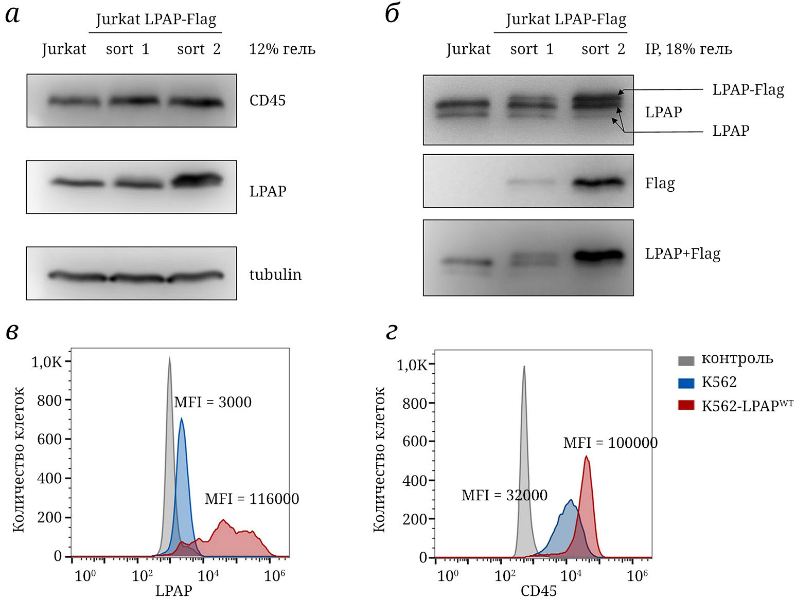 Рис. 3. В клетках с повышенной экспрессией LPAP уровень CD45 возрастает. а, б – Уровень белка LPAP анализировали в клеточных линиях Jurkat и Jurkat LPAP-Flag после первой и второй сортировки (sort 1 и sort 2). Клетки лизировали (а, б), белок LPAP или CD45 выделяли с помощью иммунопреципитации (IP) (б), образцы разделяли методом электрофореза в 12%-ном (а) или 18%-ном (б) геле, проводили Вестерн-блоттинг с указанными антителами. Нижний блот (б) окрашивали антителами против Flag и LPAP. Формы LPAP и LPAP-Flag указаны стрелками; в, г – экспрессия LPAP и CD45 на поверхности клеток K562 дикого типа, а также стабильно трансдуцированных LPAP-Flag