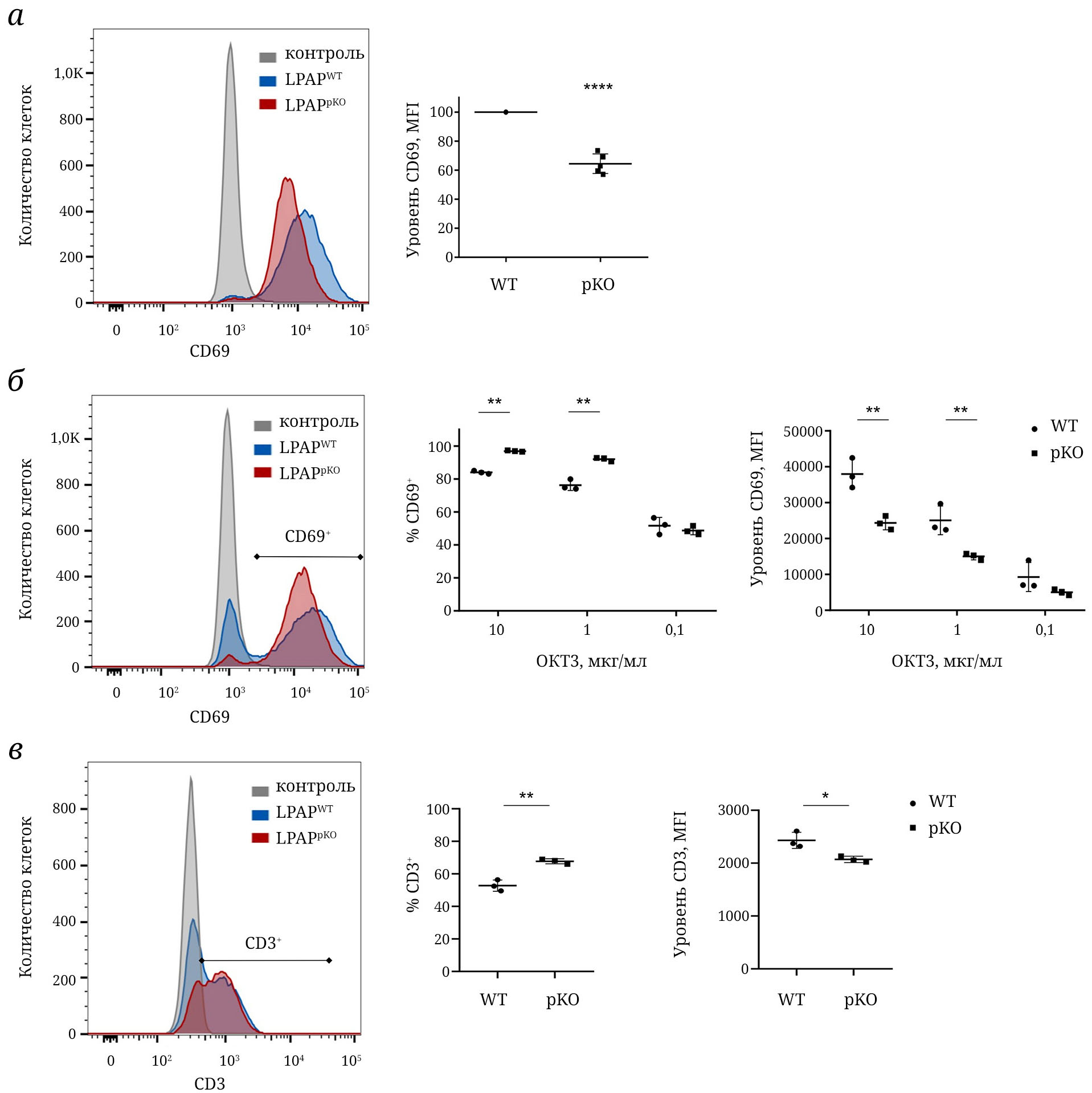 Рис. 4. Сравнение экспрессии молекул CD69 и CD3 на клетках Jurkat дикого типа и с нокаутом по LPAP. а – Экспрессия CD69 на клетках, активированных с помощью РМА; б – экспрессия CD69 на клетках, активированных с помощью антитела OKT3; в – экспрессия CD3 на клетках, активированных с помощью антитела OKT3. Уровни CD69 (б) и CD3 (в) сравнивали с помощью двухвыборочного t-критерия. * p < 0,05, ** p < 0,001, **** p < 0,0001.