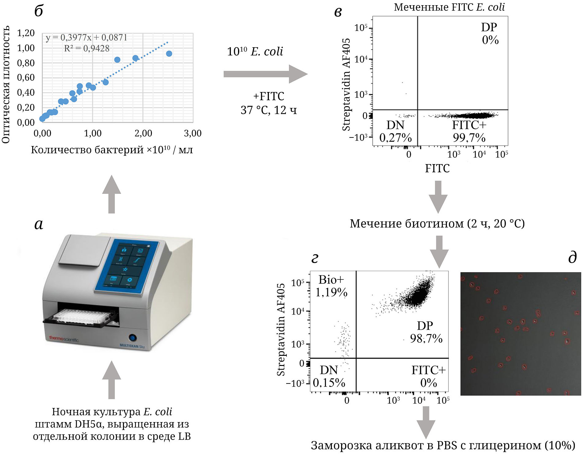 Рис. 1. Схема флуоресцентного мечения бактерий. E. coli конъюгировали FITC, а затем биотином для того, чтобы различать бактерии внутри и снаружи фагоцитирующих клеток. Показана последовательность проведения конъюгаций и контроль качества препарата E. coli. Рассчитывали концентрацию бактерий по оптической плотности (а) по заранее простроенной калибровочной кривой (б). После конъюгации E. coli с FITC проводили контрольную проточную цитометрию (в) для проверки однородности конъюгации (FITC+ 99,7%). После дальнейшей конъюгации E. coli с биотином проверяли однородность мечения в каналах AF405 и FITC – гомогенность конъюгации составила 98,7% (DP) для двух меток (г). Перед замораживанием маточной суспензии готовых бактерий подсчитывали их концентрацию по DIC и флуоресценции в заданном объёме, рассчитанном на основе известных параметров глубины фокуса и размера поля зрения (д)