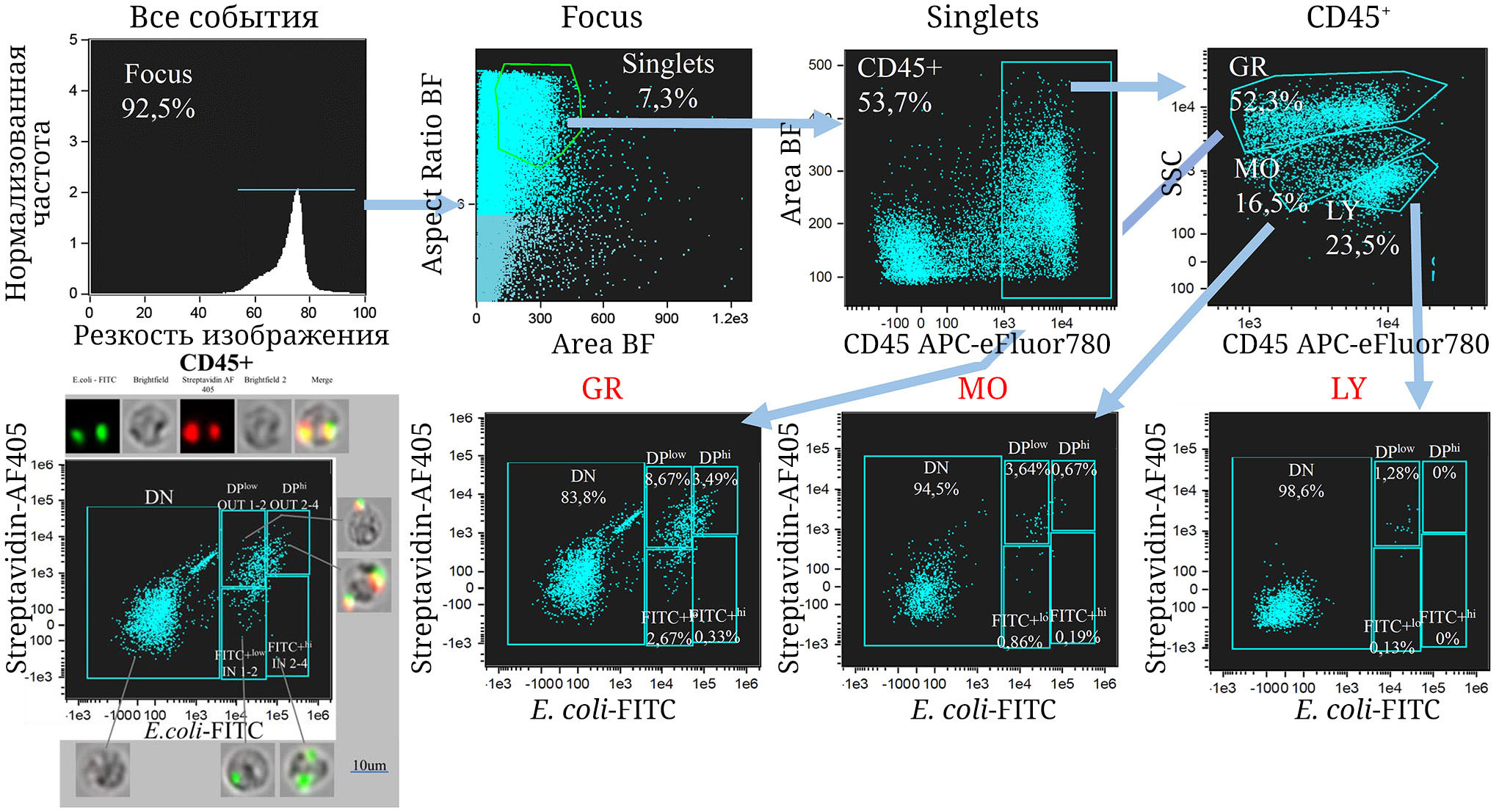 Рис. 2. Стратегия анализа и гейтирования для сортера Sony SH800: из единичных клеток (Singlets gate) выделяли лейкоциты (СD45+), далее эту популяцию сортировали по интенсивности флуоресценции и локализации бактерий (E. coli) на следующие категории: DN – двойная негативная популяция (нефагоцитировавшие клетки); Dim – клетки, флуоресценция которых не более чем на декаду выше, чем DN; Mid – клетки с умеренной интенсивностью флуоресценции (больше на декаду, чем у Dim); Bright – клетки с самой высокой интенсивностью флуоресценции; DP – двойная по FITC и AF405 позитивная популяция бактерий на поверхности (нижняя панель слева). Для анализа по субпопуляциям клетки гейтировали по гранулярности (SSC) и размеру (FSC) на гранулоциты (GR), моноциты (MO) и лимфоциты (LY). Расширенная информация по стратегии гейтирования приведена на рис. П2 Приложения