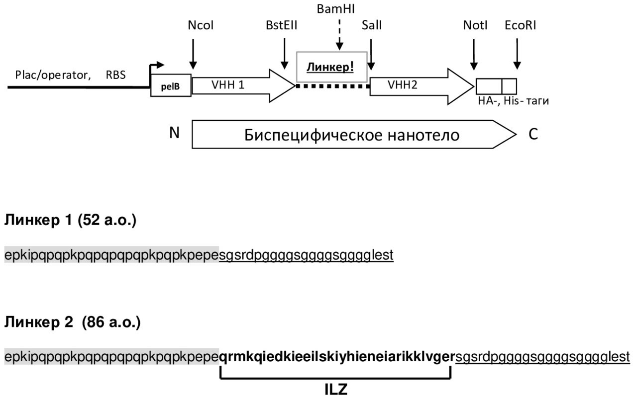 Линкер 1 (длиной 52 а.о.) состоит из длинного шарнирного участка особых антител верблюда (28 а.о.), соединённого с традиционным линкером Gly4-Ser-Gly4-Ser-Gly4 (как в фагмиде pIT2) с несколькими дополнительными а.о., а в линкере 2 (длиной 86 а.о.) между двумя указанными частями линкера 1 встроена дополнительная последовательность рекомбинантного домена ILZ [8]. Ранее было показано, что нАТ, к которым был добавлен ILZ-домен, действительно эффективно тримеризуются в периплазме бактерии сразу после их синтеза [8].