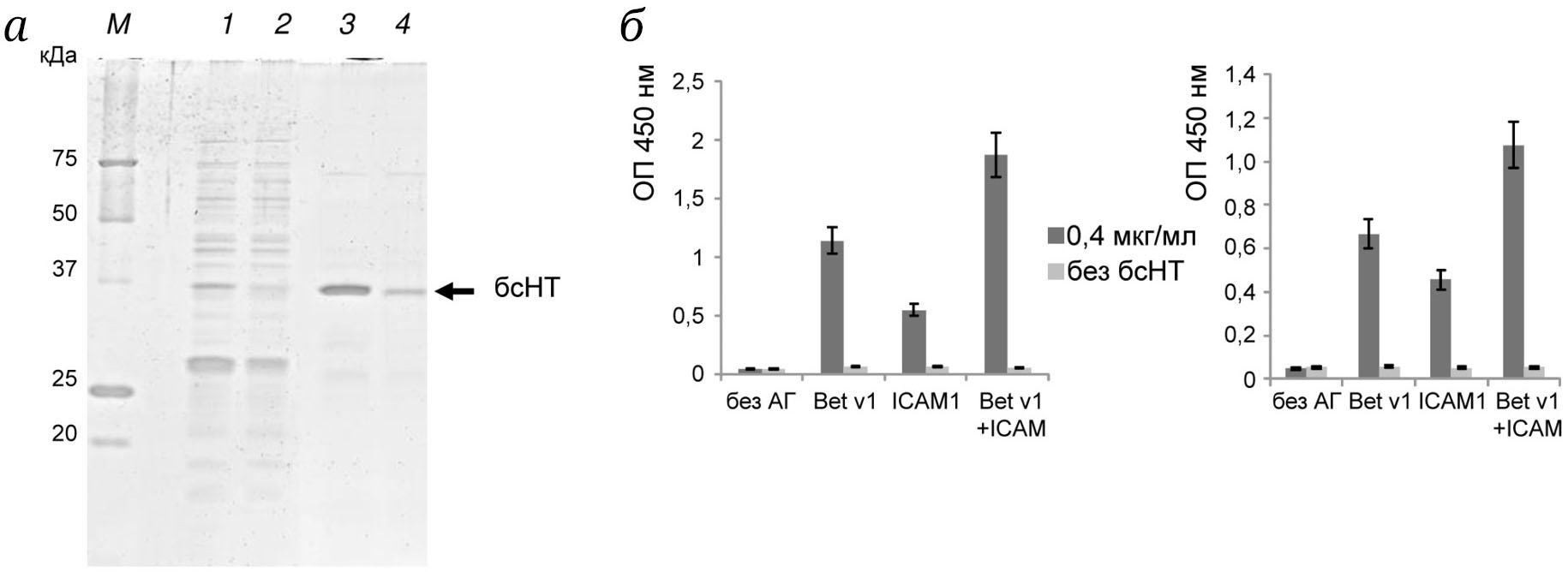 Рис. 2. SDS-PAGE и иммуноферментный анализ бсНТ aBet-л1-aICAM1 и aICAM1-л1-aBet. а – Электрофоретическое разделение в 5–19%-ном градиентном SDS-полиакриламидном геле белков периплазматических экстрактов (1, 2) и аффинно очищенных нАТ (3, 4). Стрелкой показано положение бсНТ. В крайней левой дорожке нанесён маркер (М) и указаны (в кДа) размеры маркерных полос. б – Иммуноанализ связывания полученных бсНТ в концентрации 0,4 мкг/мл с иммобилизованными рекомбинантными антигенами. Представлены усреднённые данные трёх измерений с указанием области разброса данных