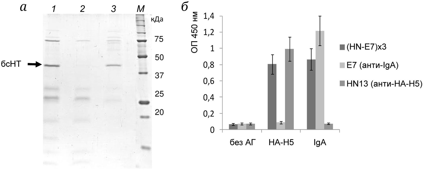 Рис. 3. SDS-PAGE и иммуноферментный анализ бсНТ aHA-л2-E7(aIgA), также обозначаемого (HN-E7)x3. а – Электрофоретическое разделение в 5–19%-ном градиентном SDS-полиакриламидном геле аффинно очищенного бсНТ, исходного (1), проскока на фильтре с номинальным отсечением по молекулярной массе 100 кДа (2), очищенного от мелких примесей и, предположительно, тримеризованного бсНТ (3), задержанного над фильтром с отсечением по молекулярной массе 100 кДа. Стрелкой показано положение мономерного бсНТ. В крайней правой дорожке нанесён маркер (М) и указаны (в кДа) размеры маркерных полос. б – Иммуноанализ связывания полученных бсНТ (HN-E7)x3, а также контрольных моновалентных нАТ (E7 – против IgA и HN13 – против гемагглютинина HA-H5 вируса птичьего гриппа) в концентрации 1 мкг/мл с иммобилизованными рекомбинантными антигенами (IgA и HA-H5). Контрольные лунки были без антигена (столбцы «без АГ»). Представлены усреднённые данные трёх измерений с указанием области разброса данных