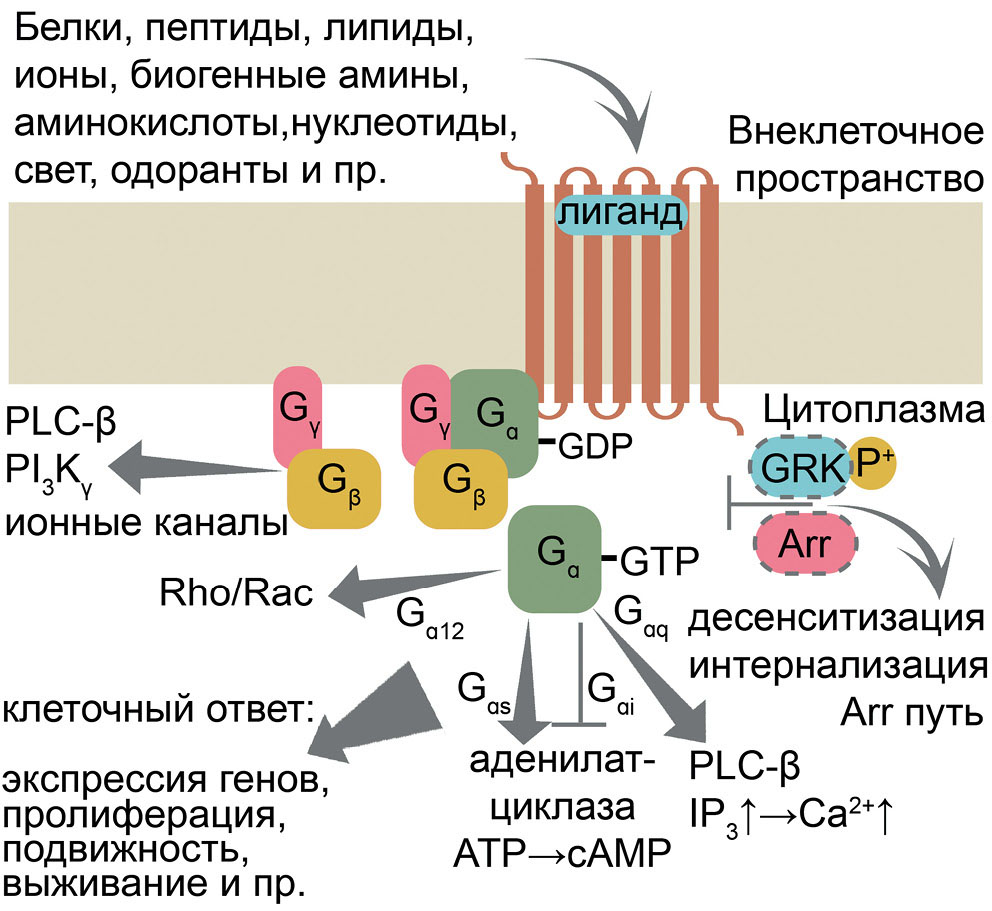 Рис. 1. Общий принцип передачи сигнала GPCR: селективный лиганд, подходя с внеклеточной стороны, активирует рецептор, который, претерпевая конформационные изменения, активирует G-белок – гетеротример, состоящий из α-, β- и γ-субъединиц. Активированный рецептор, который взаимодействует с гетеротримером как с целым, инициирует его диссоциацию, катализируя обмен GDP на GTP в нуклеотидном центре Gα-субъединицы, которая определяет дальнейший каскад реакций. Например, Gα12/13 запускает путь Rac/Rho малых GTPаз; Gαs стимулируют, а Gαi/o ингибируют аденилатциклазу, катализирующую превращение аденозинтрифосфата (ATP) в циклический аденозинмонофосфат (cAMP); Gαq стимулирует фосфолипазу C-β (PLC-β), отщепляющую от фосфатидилинозитолбифосфата (его изоформы PI-3,5-P2) инозитол трифосфат (IP3), повышение концентрации которого приводит к высвобождению внутриклеточного кальция. Вторичные мессенджеры включают соответствующий клеточный ответ. Gβγ-Субъединицы также запускают ряд сигнальных путей, например, взаимодействуя с ионными каналами, липидными киназами (фосфоинозитид-3-киназа-γ, PI3Kγ) и фосфолипазами (PLC-β). При длительной активации рецептор может фосфорилироваться, например, GPCR-киназой (GRK), что приводит к связыванию с белком-аррестином (Arr), прекращающим G-белок-ассоциированный сигнальный путь [5]