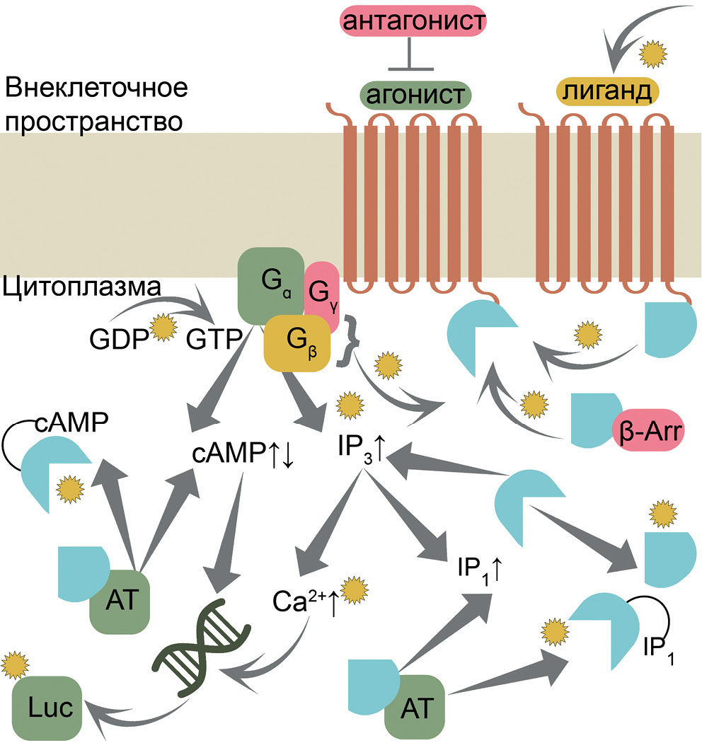 Функциональные тесты in vitro на основе клеточных культур. В случае, когда in vitro данных о связывании недостаточно и требуется анализ уровня активации рецептора и его фармакологический профиль, используют клеточные функциональные тесты. При связывании лиганда с GPCR активируются каскады внутриклеточных сигнальных путей, при этом происходят биохимические реакции, белок-белковые взаимодействия, изменение внутриклеточной концентрации вторичных мессенджеров – события, которые можно количественно детектировать и анализировать. При этом часть из этих событий происходят непосредственно после активации рецептора (реакции гетеротримерного G-белка или аррестина), другие – в диапазоне от цитоплазматических реакций до активации факторов транскрипции контролируемых генов. На рис. 2 обозначена принципиальная классическая схема активации GPCR с указанием основных мест количественной детекции клеточного ответа при помощи люминесцентных или флуоресцентных сенсоров.