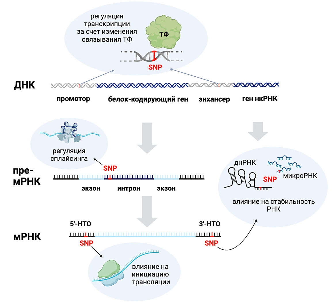 Несмотря на то, что геномы людей на 99,9% идентичны, именно оставшиеся 0,1% генетических вариаций лежат в основе фенотипических различий, в том числе восприимчивости к болезням [1]. К таким генетическим вариантам относят однонуклеотидные полиморфизмы (SNV, Single Nucleotide Variation или SNP, Single Nucleotide Polymorphism), инсерции/делеции (indel), а также структурные вариации длиной более 50 п.н. (SV, Structural Variation) [2]. Наиболее распространенным генетическим вариантом является SNP – вариация (вариант аллеля) последовательности ДНК размером в один нуклеотид у представителей одного вида, встречающаяся в популяции с частотой не менее 1% [3]. SNP встречаются в геноме каждые 200–300 п.н., располагаются как в кодирующих частях генома, так и в регуляторных (промоторы, энхансеры, интроны и нетранслируемые области) [4, 5]. Актуальность изучения SNP заключается в том, что такие генетические варианты часто ассоциированы с различными заболеваниями, что показано с помощью многочисленных полногеномных исследований (Genome-Wide Association Studies, GWAS). Порядка 95% клинически значимых SNP локализованы в некодирующих областях генома [6], и их функциональная значимость может быть связана с изменением регуляторных характеристик областей, окружающих полиморфизм [7]. К таким регуляторным областям эукариотического генома можно отнести промоторы, энхансеры 5′- и 3′-нетранслируемые области (НТО) белок-кодирующих генов, области генов некодирующих РНК (нкРНК) и регуляторные элементы сплайсинга (SRE, splicing regulatory elements) [5, 8]. Промоторы инициируют транскрипцию генов, а энхансерные элементы усиливают эту инициацию [9]. Промоторы являются предпочтительными местами посадки транскрипционных факторов (ТФ) и РНК-полимеразы II на ДНК и включают в себя область первого транскрибируемого нуклеотида транскрипта (сайт начала транскрипции, TSS) [10]. Энхансеры, впервые идентифицированные с помощью репортерного анализа как элементы, способные увеличивать экспрессию репортерного гена [11], представляют собой платформы для связывания ТФ, способные действовать независимо от ориентации, расстояния и расположения по отношению к гену-мишени [12]. 5′- и 3′-НТО играют важную роль в посттранскрипционной регуляции экспрессии генов и являются частью зрелой кодирующей мРНК. Так, 5′-НТО содержат различные регуляторные компоненты, влияющие на инициацию трансляции, а в состав 3′-НТО входят последовательности, связывающие микроРНК и приводящие к деградации транскрипта [5]. Также следует отметить, что некодирующие полиморфизмы в составе НТО могут участвовать и в регуляции транскрипции, поскольку последовательность 5′-НТО обычно пересекается с промоторными регионами генов, а последовательность 3′-НТО может пересекаться с другими регуляторными элементами генов – например, энхансерами [13]. Некодирующие полиморфизмы также располагаются в нкРНК, о влиянии которых на созревание РНК, регуляцию транскрипции, ремоделирование хроматина и посттранскрипционные модификации РНК за последние годы получено много информации [14].