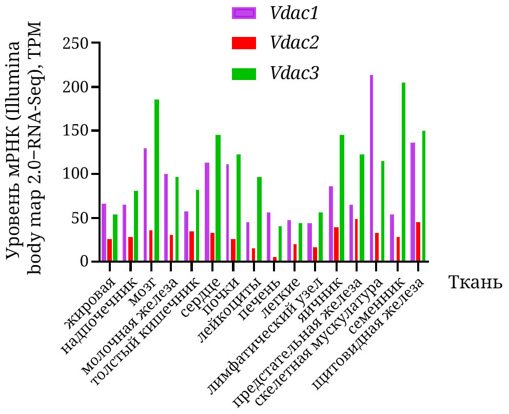 Три изоформы VDAC широко представлены во всех тканях млекопитающих, причём самый высокий уровень экспрессии пориновых белков наблюдается в скелетной мускулатуре [16, 27]. После терминации трансляции готовые белки доставляются к внешней мембране митохондрий, что обеспечивается наличием специфической сигнальной последовательности на N-конце. Стоит отметить, что при ряде патологий, сопровождающихся сверхэспрессией пориновых каналов, направленный транспорт этих белков в клетках может нарушаться, вследствие чего они начинают встраиваться в цитоплазматические мембраны [28]. Методами иммуноблоттинга и ПЦР в реальном времени было показано, что в норме уровни экспрессии белков VDAC1 и VDAC2 сопоставимы, в то время как содержание белка VDAC3 в большинстве тканей и органов млекопитающих, за исключением семенников, существенно ниже [27]. Однако согласно данным атласов экспрессии (например, Expression Atlas EMBL-EBI), ген, кодирующий VDAC3, имеет достоверно более высокий уровень транскрипции во многих тканях по сравнению с генами, кодирующими две другие изоформы (рис. 2), что может быть связано с высокой активностью промотора гена VDAC3. Кроме того, промотор VDAC3 содержит полипиримидиновый участок, который считается специфической мишенью окислительного стресса [29]. Таким образом, количественное соотношение трёх изоформ VDAC в клетке регулируется за счёт разной степени стабильности их транскриптов, причём поддержание высокого уровня экспрессии VDAC3 необходимо для быстрого реагирования на меняющиеся внешние условия [30]. Подтверждением этого могут служить обнаруженные недавно особенности локализации трёх изоформ во внешней митохондриальной мембране. Показано, что hVDAC1 и hVDAC2 обычно колокализованы в одних и тех же относительно больших доменах (300–900 нм2) внешней мембраны, в то время как hVDAC3 равномерно распределён по всей её площади [31]. Важно отметить также и различия в действии ряда факторов регуляции транскрипции, активность которых для промотора каждого гена может меняться в зависимости от условий. Более подробные сведения об этом можно найти в работах De Pinto et al., Nepal et al. и Zinghirino et al. [5, 29, 32].