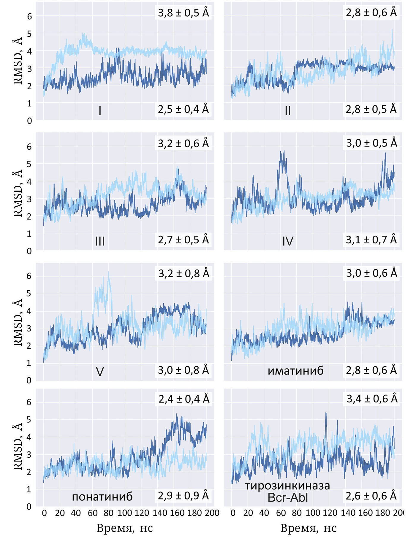 Рис. 2. Временные зависимости значений RMSD (Å), рассчитанных между динамическими и стартовыми структурами комплексов соединений I−V с тирозинкиназой Bcr-Abl (голубая линия) и Bcr-AblT315I (синяя линия). В правом верхнем углу указаны средние значения RMSD и стандартные отклонения для нативного фермента, а в правом нижнем – для его мутантной формы. Приведены также соответствующие данные для контрольных соединений и фермента в свободном состоянии