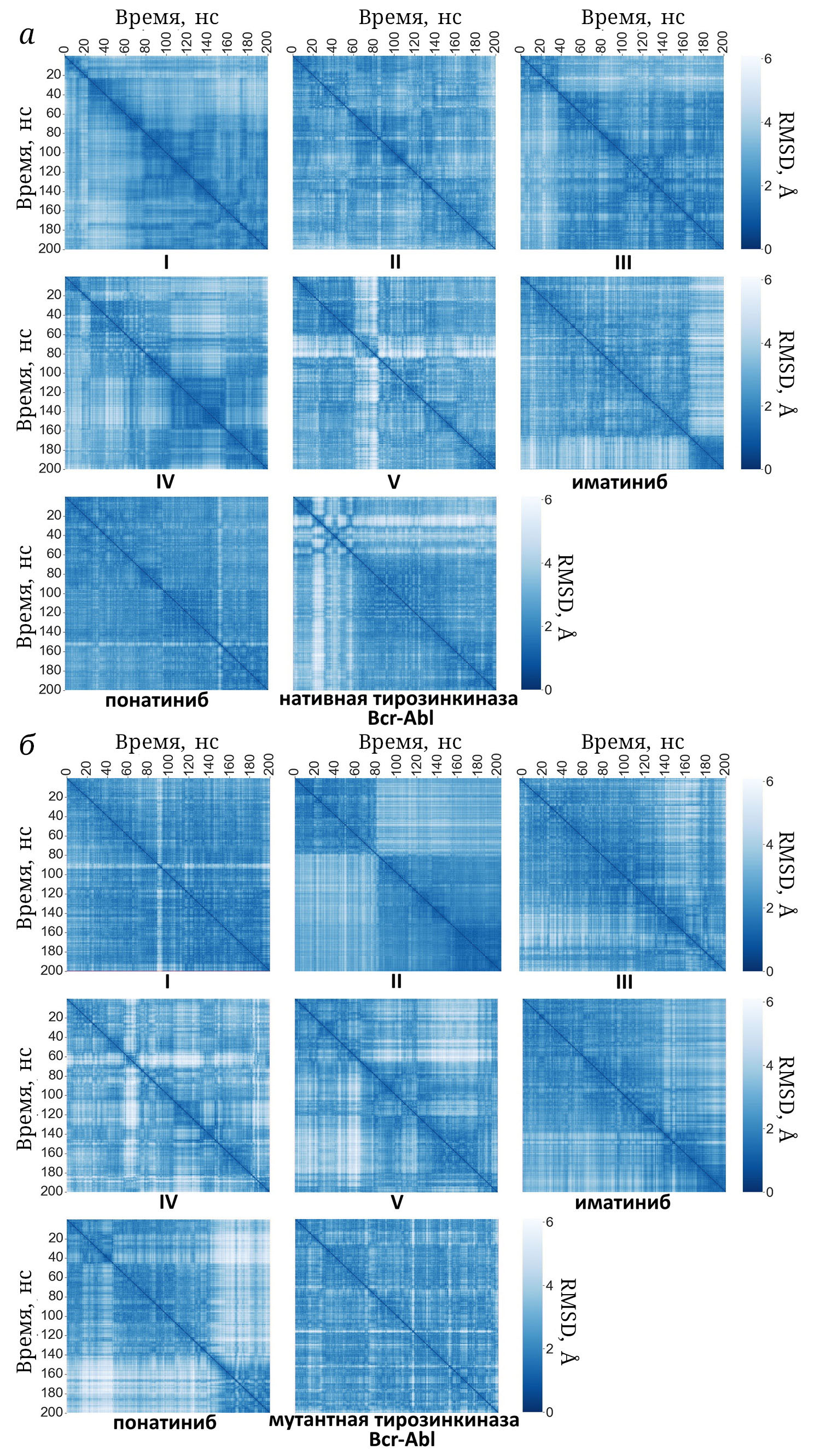 Рис. 3. Тепловые карты RMSD, полученные для комплексов тирозинкиназы Bcr-Abl (а) и ее мутантной формой T315I (б) с соединениями I−V, контрольными ингибиторами и фермента в свободном состоянии в разное время моделирования МД. Значения RMSD рассчитывали для атомов основной цепи тирозинкиназы. Время измеряется по осям абсцисс и ординат. Значение RMSD между структурами комплексов в моменты времени t1 и t2 находится на пересечении значений t1 по оси абсцисс и t2 по оси ординат