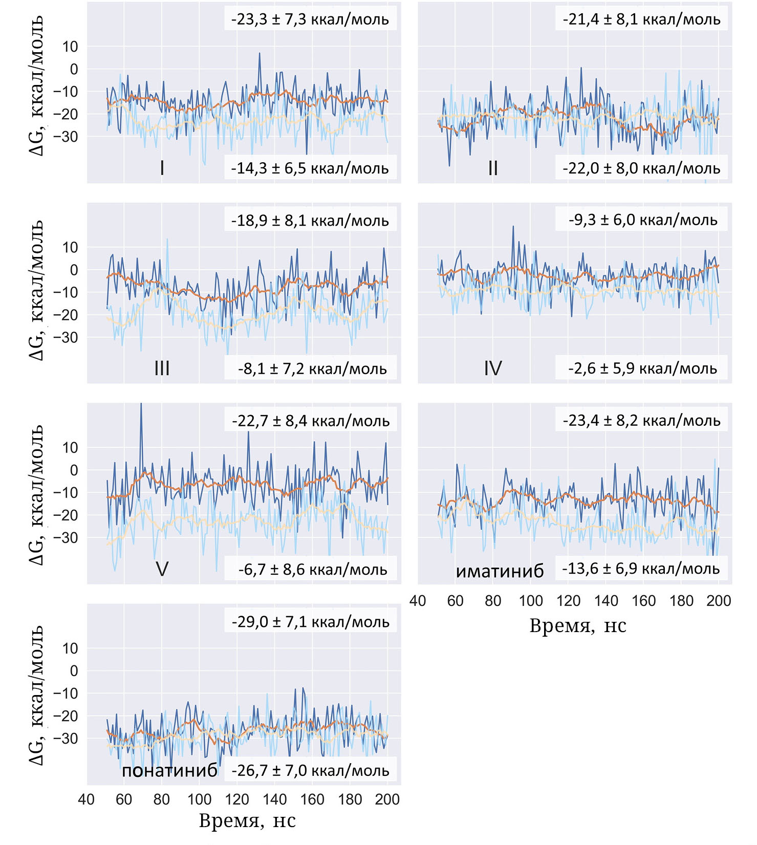 Рис. 4. Временные зависимости свободной энергии связывания для комплексов соединений I−V с тирозинкиназой Bcr-Abl (голубая линия) и Bcr-AblT315I (синяя линия). С помощью оранжевой и желтой линий показано простое скользящее среднее с размером окна 20 нс. Сверху и снизу приведены средние значения свободной энергии связывания и соответствующие им стандартные отклонения, рассчитанные соответственно для нативной и мутантной тирозинкиназы Bcr-Abl. Приведены также соответствующие данные для контрольных соединений