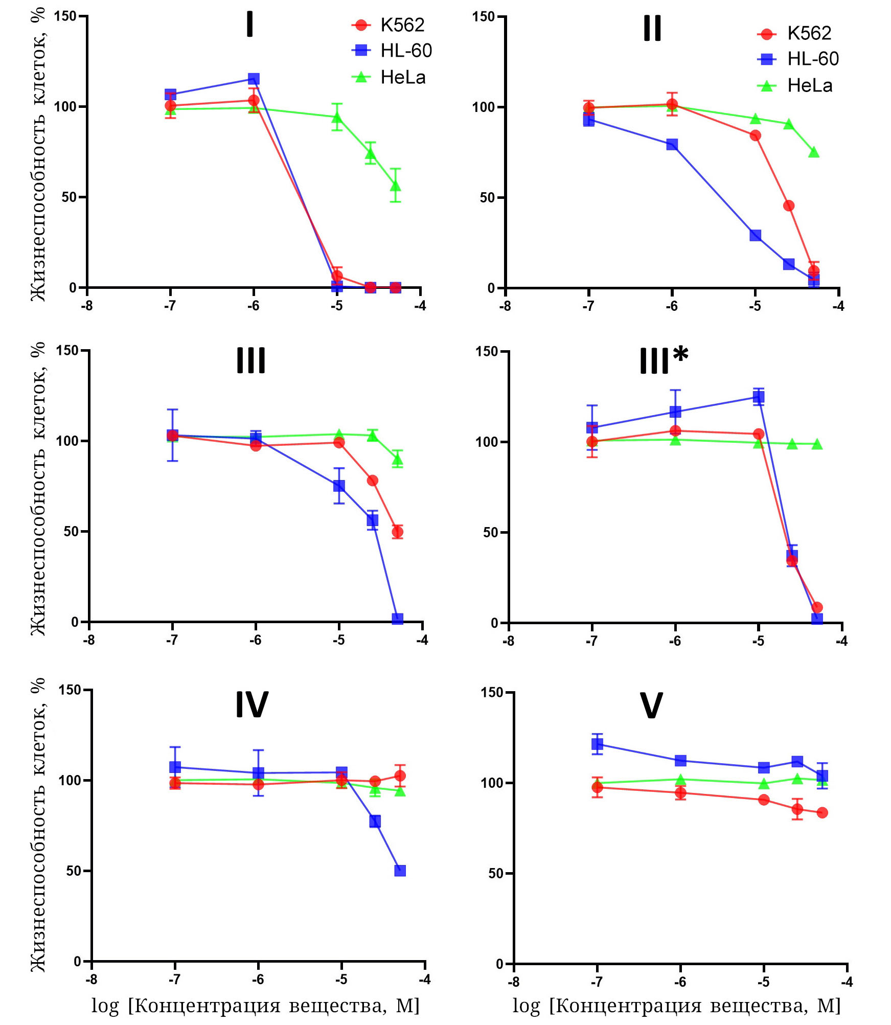 Рис. 5. Зависимости жизнеспособности клеток (% от контроля) от концентрации исследуемых соединений (log концентрации [моль/литр]). III* − Солевая форма соединения III в виде метансульфоната