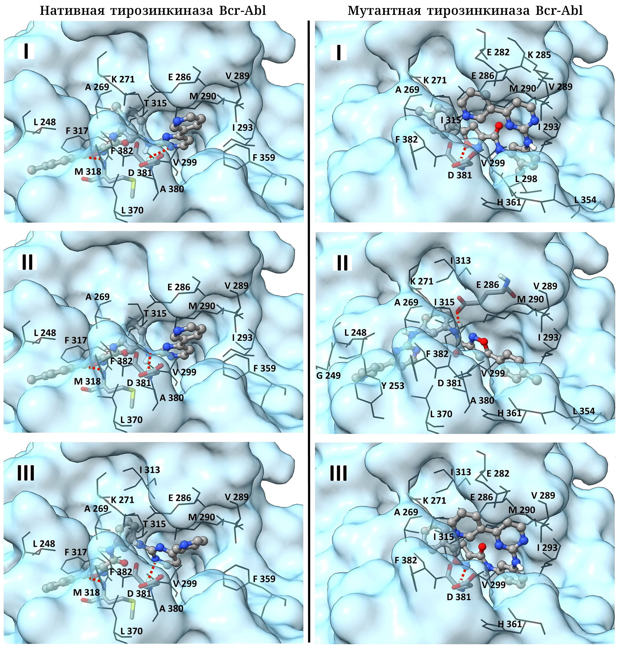Рис. 6. Комплексы соединений I–III с нативной и мутантной тирозинкиназой Bcr-Abl, построенные методом молекулярного докинга. Соединения представлены моделью «шарик-палочка-шарик». Отмечены остатки фермента, образующие межатомные контакты с лигандами. Остатки, участвующие в водородных связях, обозначены палочковой моделью. Водородные связи показаны красными пунктирными линиями. Проволочная модель использована для обозначения остатков тирозинкиназы Bcr-Abl, образующих контакты Ван-дер-Ваальса