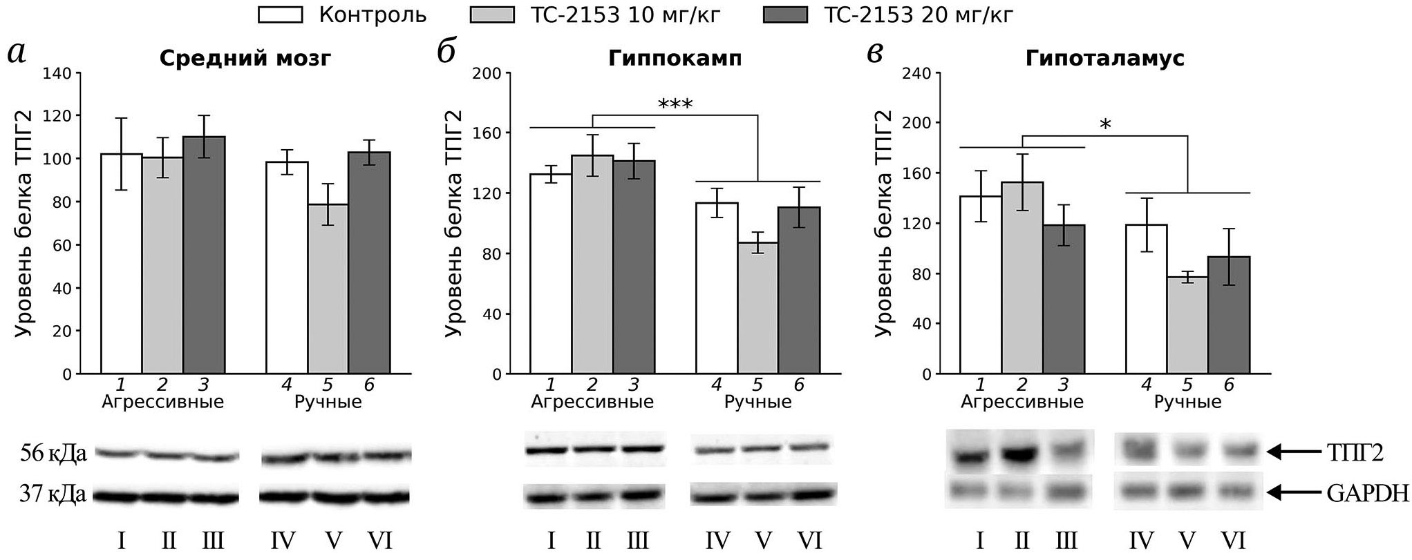 Влияние однократного введения ТС-2153 на уровень белка ТПГ2 в мозге у агрессивных и ручных крыс. Значительный эффект влияния генотипа на уровень белка ТПГ2 наблюдался в гиппокампе (F1,41 = 16,45, p < 0,001) (рис. 3, б) и гипоталамусе (F1,37 = 7,01, p < 0,05) (рис. 3, в), но не в среднем мозге (F1,35 = 1,55, p > 0,05) (рис. 3, а). Уровень экспрессии этого белка был повышен в гиппокампе и гипоталамусе агрессивных крыс по сравнению с ручными. Ни в одной из исследованных структур не было обнаружено эффекта однократного введения ТС-2153 (средний мозг: F2,35 = 1,26, p > 0,05; гиппокамп: F2,41 < 1; гипоталамус: F2,37 < 1) и эффекта взаимодействия «генотипа» и «препарата» (средний мозг: F2,35 < 1; гиппокамп: F2,41 = 1,68, p > 0,05; гипоталамус: F2,37 = 1,26, p > 0,05).