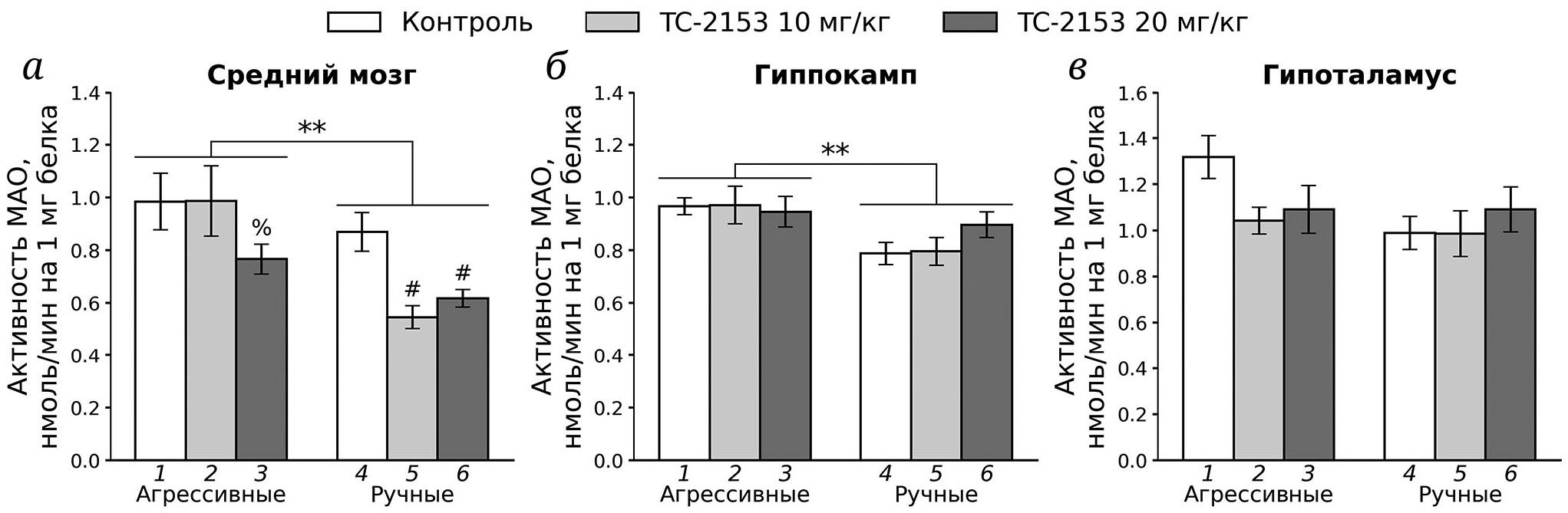 Рис. 4. Влияние однократного введения растворителя (контроль) и ТС-2153 в дозировках 10 и 20 мг/кг на активность МAO (нмоль/мин на 1 мг белка) in vitro в среднем мозге (а), гиппокампе (б) и гипоталамусе (в) у агрессивных и ручных крыс. ** p < 0,01 – эффект генотипа, # p < 0,05, % p = 0,07 в сравнении с контрольной группой (7–8 животных в группе). 1 – Агрессивные, контроль; 2 – агрессивные, ТС-2153: 10 мг/кг; 3 – агрессивные, ТС-2153: 20 мг/кг; 4 – ручные, контроль; 5 – ручные, ТС-2153: 10 мг/кг; 6 – ручные, ТС-2153: 20 мг/кг
