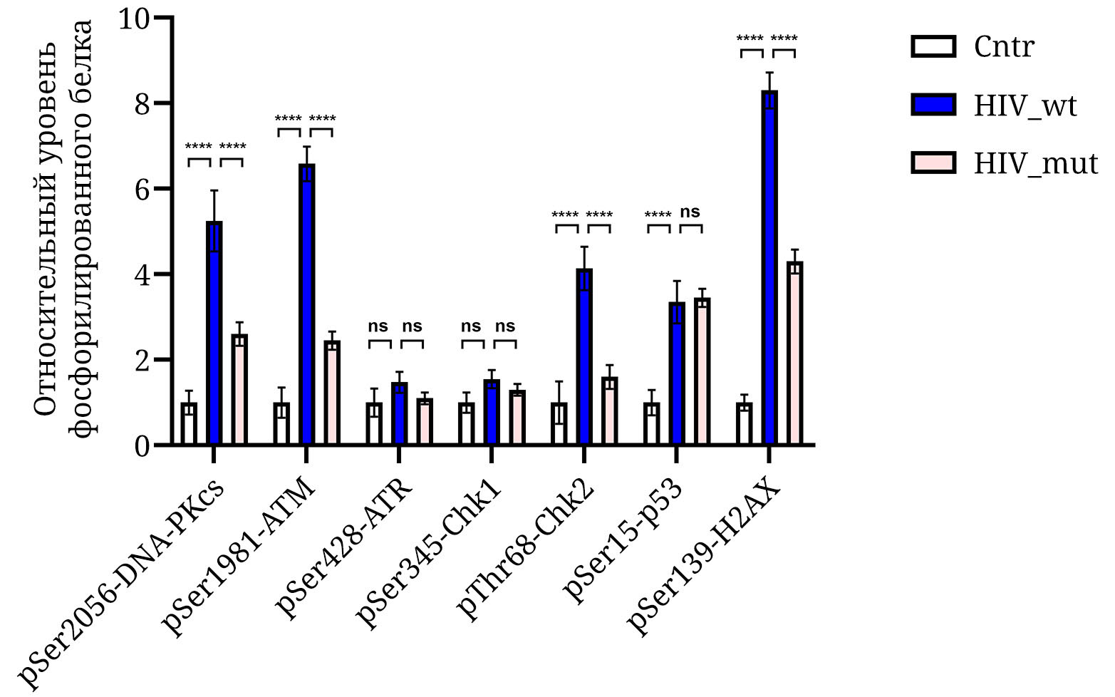 Рис. 1. Анализ уровня фосфорилирования белков DNA-PKcs, ATM, ATR, Chk1, Chk2, p53 и H2AX в клетках, трансдуцированных HIV_wt, HIV_mut или нетрансдуцированном контроле (Cntr), через 12 ч после добавления лентивирусных векторов. На графике представлены уровни фосфорилированной формы белка в клетках, трансдуцированных HIV_wt или HIV_mut, относительно нетрансдуцированного образца (среднее ± SD по трем независимым повторам). Статистическая значимость изменений в уровне фосфорилированного белка оценивалась с помощью двухфакторной ANOVA c поправкой на множественные сравнения по Тьюки; ns – статистические отличия отсутствуют, **** p-value < 0,0001