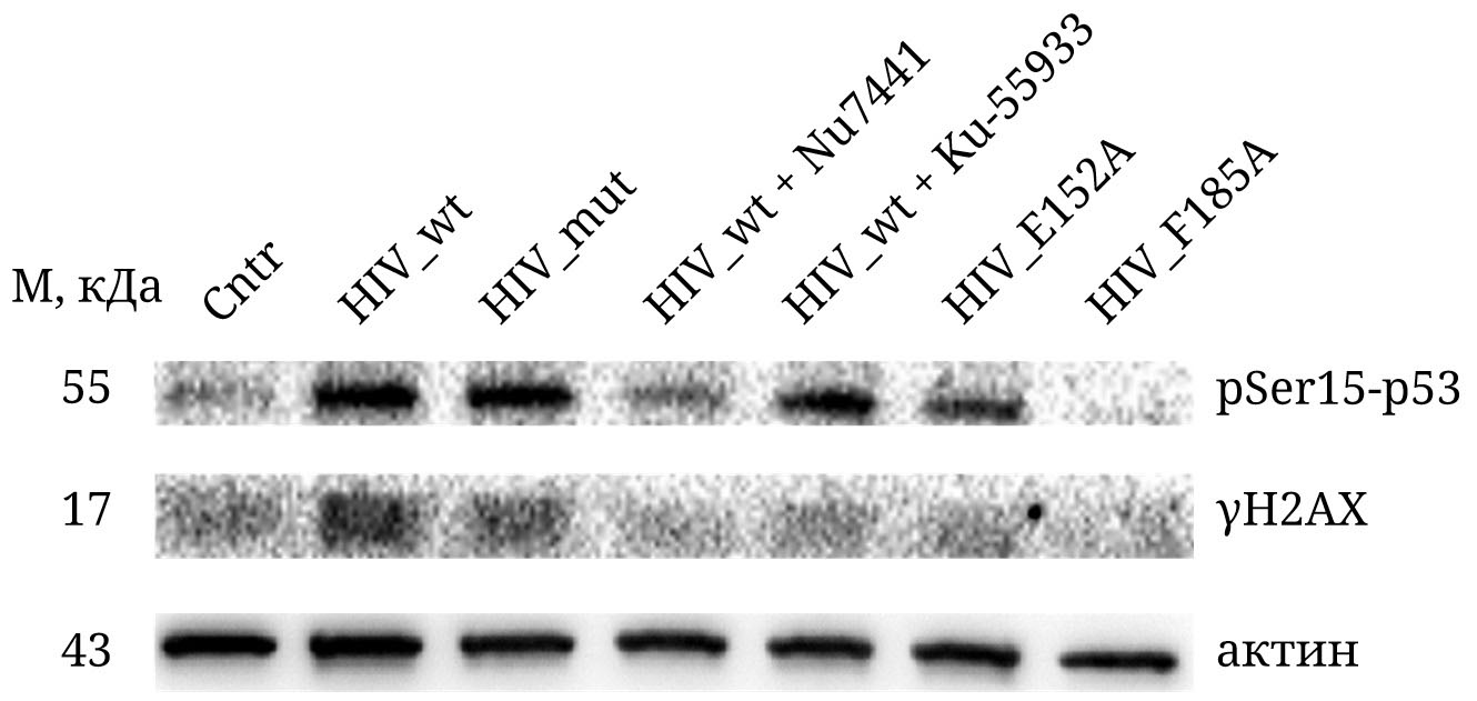 Рис. 2. Вестерн-блот-анализ фосфорилированных форм p53 (pSer15) и H2AX (pSer139). Cntr – нетрансдуцированные вектором клетки; HIV_wt, HIV_mut, HIV_E152A, HIV_F185A – клетки, трансдуцированные векторами на основе ВИЧ-1 с природным вариантом интегразы или соответствующей мутантной формой; образцы HIV_wt + Nu7441 и HIV_wt + Ku-55933 после трансдукции клеток вектором HIV_wt дополнительно обрабатывали ингибитором DNA-PKcs – Nu7441 (2 мкМ), или ингибитором ATM – Ku-55933 (5 мкМ)