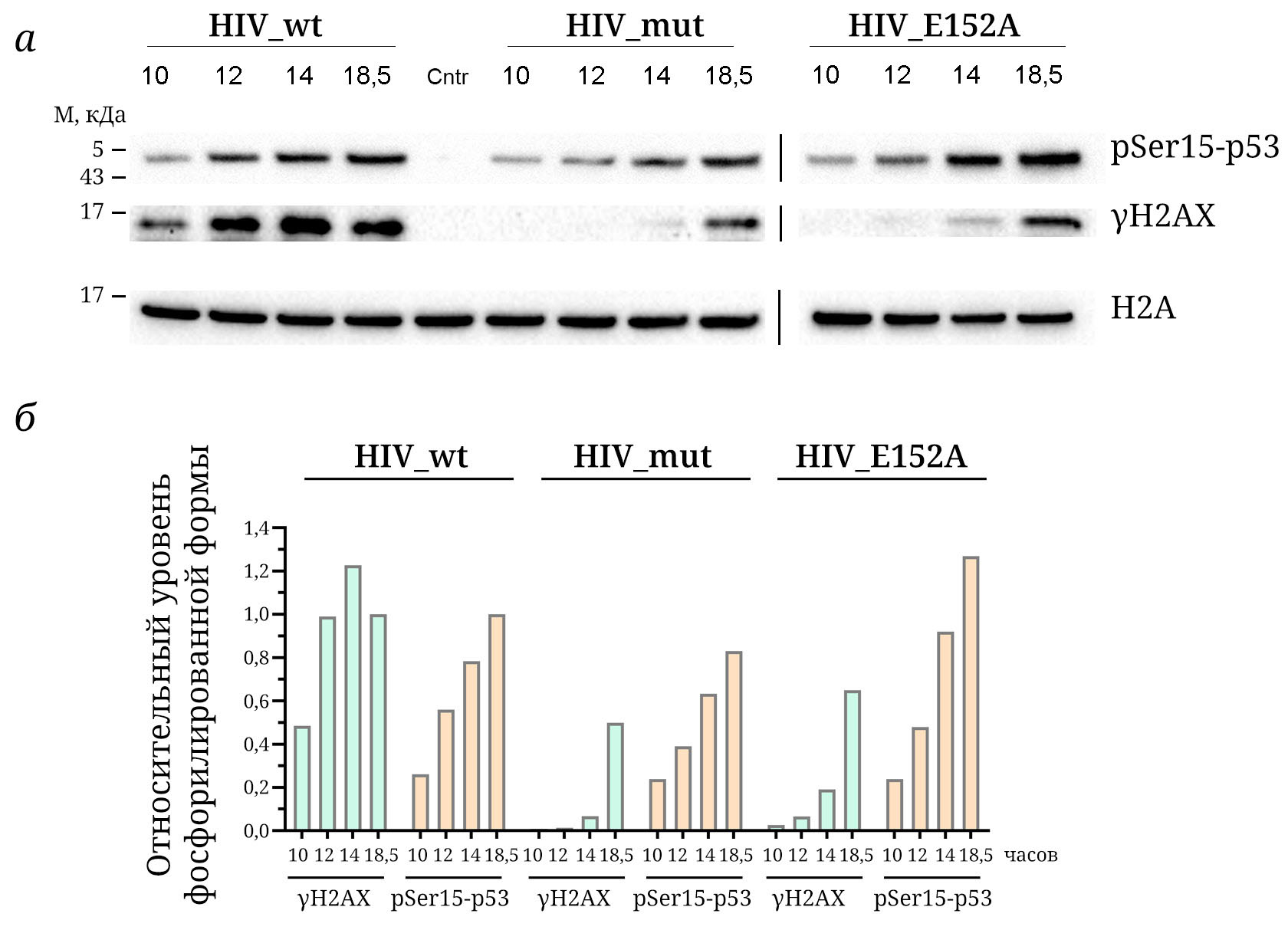Вестер-блот-анализ. 1 млн клеток HEK293T трансдуцировали лентивирусным вектором HIV_wt при множественности инфекции (MOI), равной 10, или эквивалентным количеством лентивирусных векторов HIV_mut, HIV_E152A или HIV_F185A. Через 2 ч среду с несвязавшимся вектором отбирали, клетки промывали 2 раза 1× ФСБ (фосфатно-солевой буфер, pH = 7,4), после чего помещали в среду для культивирования. Через 10 ч после трансдукции клетки лизировали при 4 °С RIPA-буфером («Servicebio», Китай) с добавлением ингибиторов фосфатаз Phosphatase inhibitor cocktail 2 и 3 («Sigma», США), а также ингибиторов протеаз Halt protease inhibitor cocktail («Pierce», США). Перед анализом остатки клеток удаляли центрифугированием при 14 000 g в течение 10 мин при 4 °С. Для каждой экспериментальной точки определяли содержание белка в образцах с помощью набора DC protein assay kit («Bio-Rad», США), на гель наносили одинаковое количество белка. Анализируемые образцы клеточных лизатов разделяли в градиентном (4–15%) геле Mini-PROTEAN® TGX™ Precast Protein Gels («Bio-Rad»), переносили на PVDF-мембрану («Bio-Rad») методом полусухого переноса на приборе Trans-Blot Turbo Transfer System («Bio-Rad»). Исследуемые белки визуализировали первичными мышиными антителами на фосфорилированные формы р53 (pSer15), первичными кроличьими антителами на DNA-PK (pSer2056), ATM (pSer1981), ATR (pSer428), Chk1 (pThr68), Chk2 (pSer345), γH2AX (pSer139) («Cell Signaling Technology», США). В качестве вторичных антител использовали HRP-конъюгированные антитела против кроличьих или мышиных антител («Cell Signaling Technology»). Визуализацию целевых белковых полос проводили с помощью субстрата пероксидазы хрена Clarity Western ECL substrate («Bio-Rad») в системе детекции люминесценции ChemiDoc MP system («Bio-Rad»).