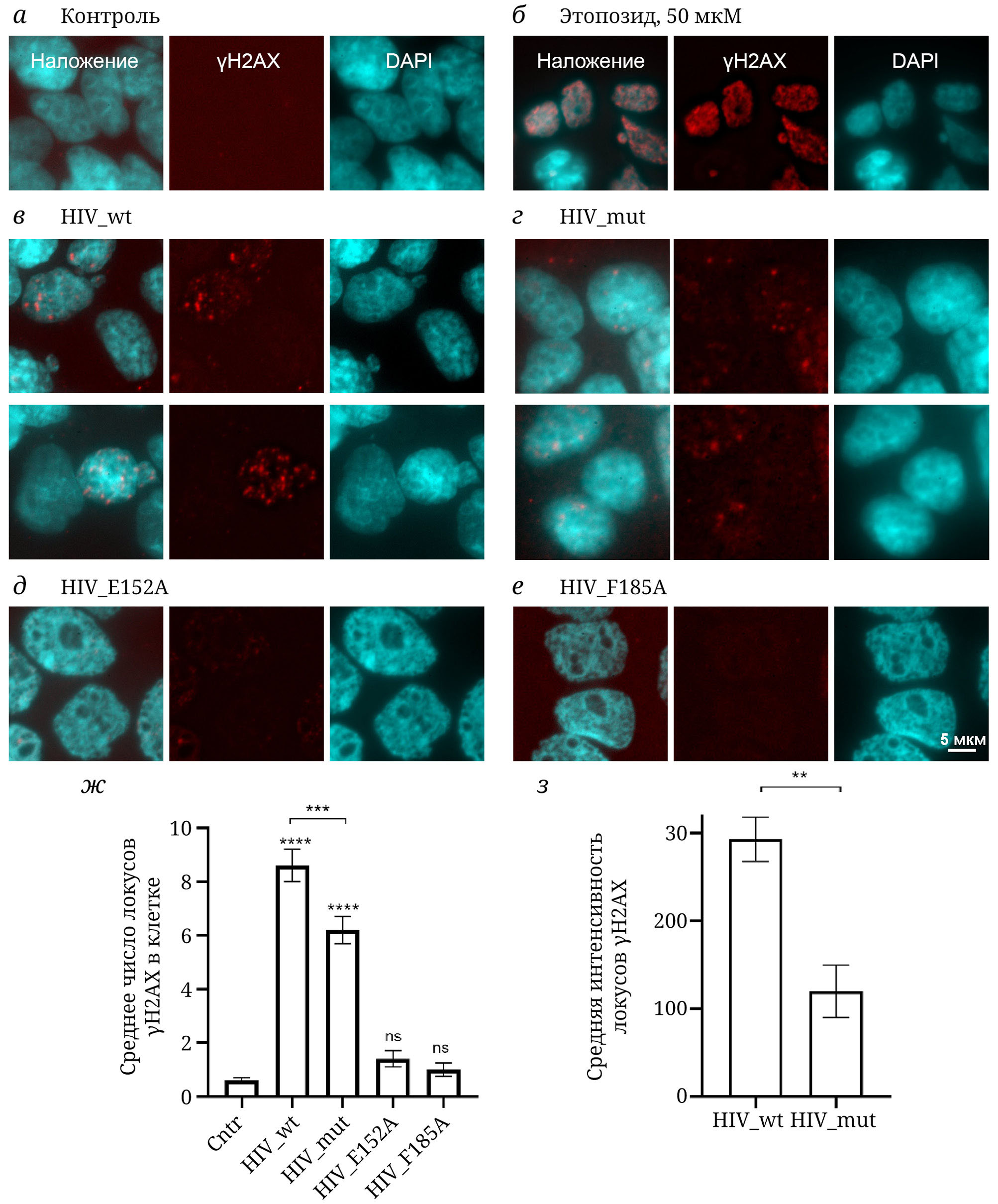 При трансдукции клеток вектором HIV_wt через 12 ч после добавления псевдовируса в ядрах клеток мы зафиксировали образование четко различимых локусов гистона γH2AX разной интенсивности (рис. 4, в). В случае обработки клеток векторами HIV_E152A и HIV_F185A уровень γH2AX практически не отличался от контрольных клеток (рис. 4, д и е). При трансдукции клеток вектором HIV_mut, не способным эффективно инициировать ПИР, мы также наблюдали формирование локусов γH2AX (рис. 4, г), однако их среднее число на клетку и средняя интенсивность флуоресценции локусов была ниже, чем в случае HIV_wt в 1,4 и 2 раза соответственно (рис. 4, ж и з).