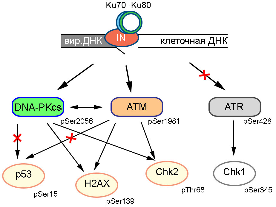 Рис. 5. Фосфорилирование белков из систем клеточного ответа на двуцепочечные разрывы ДНК при постинтеграционной репарации ВИЧ-1. Интеграза ВИЧ-1, расположенная в местах встраивания генома ВИЧ-1 и, соответственно, маркирующая повреждения ДНК, привлекает гетеродимерный комплекс Ku70–Ku80. Данный комплекс является строго необходимым для привлечения DNA-PK и ATM и последующей активации этих киназ в местах повреждений ДНК, вызванных интеграцией ВИЧ-1. DNA-PK и ATM автофосфорилируются по pSer2056 и pSer1981. Активированные в ходе ПИР киназы фосфорилируют мишени H2AX и Chk2, но не p53. ATR в ПИР не участвует и не активируется