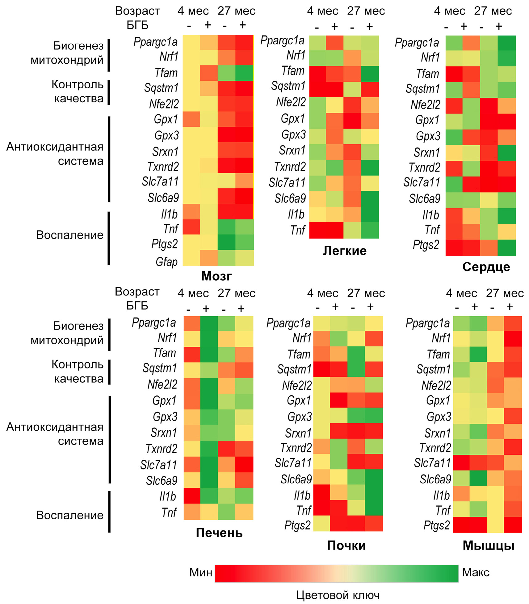 Рис. 3. Тепловые карты, отражающие влияние возраста и подкожных инъекций БГБ на уровень экспрессии генов в мозге, лёгких, сердце, печени, почках и мышцах крыс