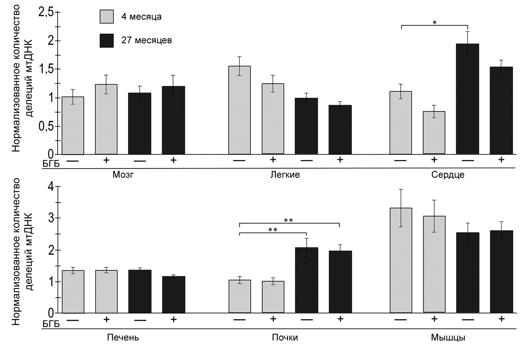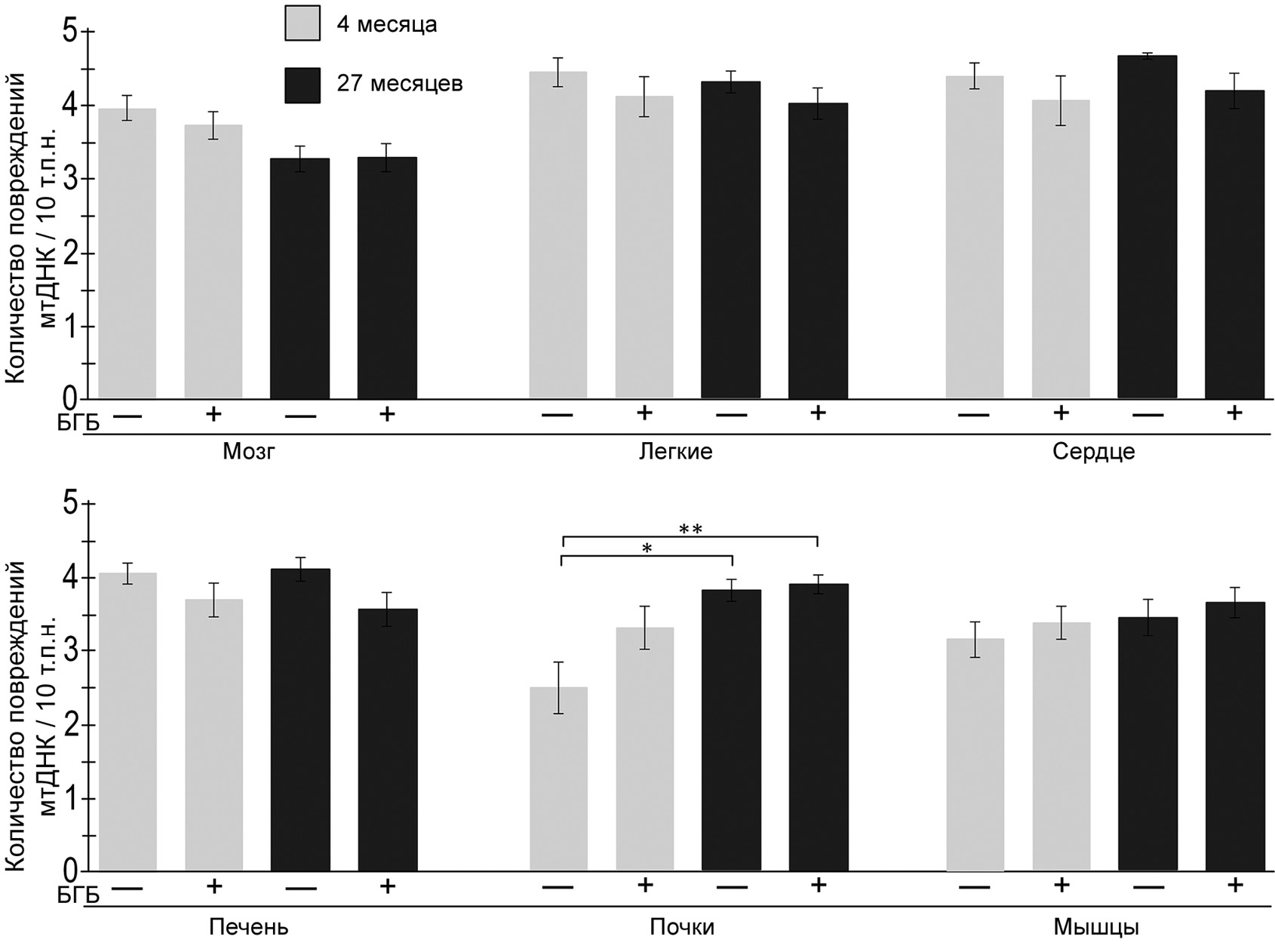 Рис. 5. Влияние подкожных инъекций БГБ на количество повреждений мтДНК в разных тканях крыс разного возраста. Результаты представлены в виде средних значений ± ошибка среднего. Достоверность различий с контрольной группой 4-месячных крыс: * p < 0,05; ** p < 0,01 (критерий Краскела–Уоллиса)