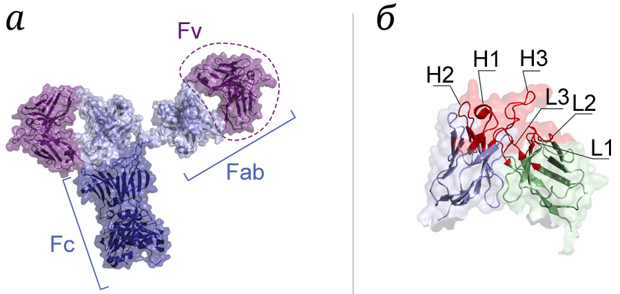 Рис. 1. Структура иммуноглобулина G (PDB: 1HZH) (а) и вариабельных петель (CDRs) в составе Fv-домена (б)