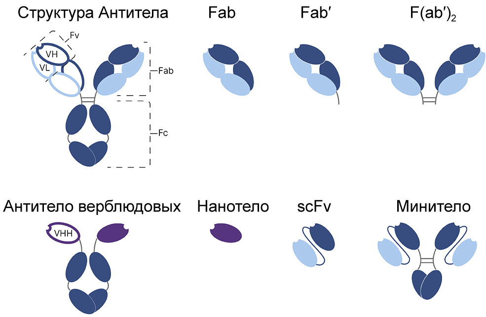 Фрагменты антител. Структура и методы разработки фрагментов антител. Как отмечалось выше, разработка и производство антител является дорогостоящим процессом, требующим постоянного контроля. В связывании антител с мишенью задействован только вариабельный домен антитела, поэтому были разработаны укороченные варианты антител, сохраняющие способность связываться с мишенью. С помощью методов генной инженерии были получены разнообразные формы белок-связывающих фрагментов антител, такие как одноцепочечный вариабельный фрагмент (scFv), отдельный антигенсвязывающий фрагмент (Fab′), минитела, нанотела и др. [58–60]. Сравнение структуры антител и их гомологов показано на рис. 3.