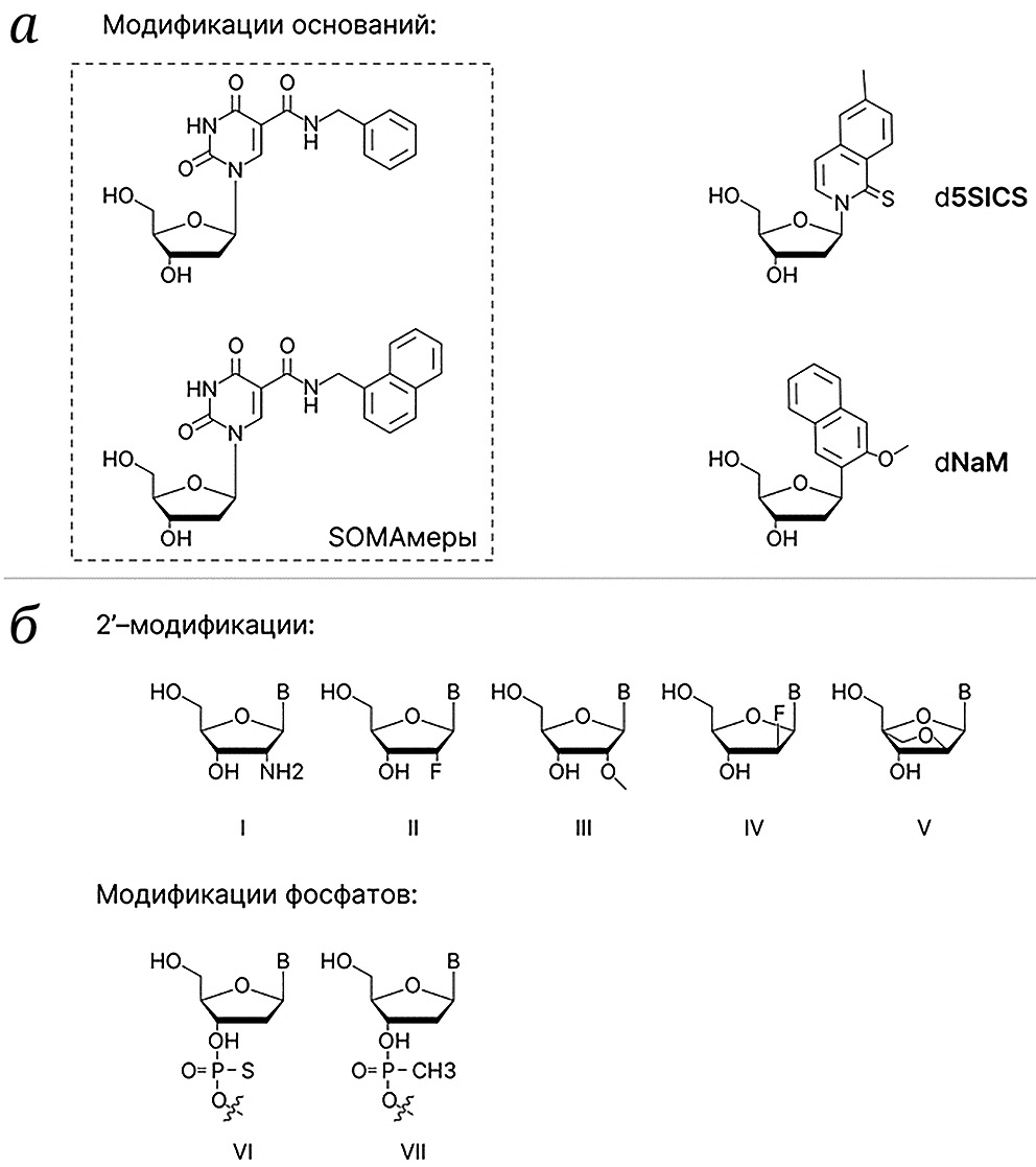 Рис. 5. Модификации нуклеиновых кислот для увеличения аффинности аптамеров и их устойчивости к действию нуклеаз. а – Модификации оснований для добавления свойства гидрофобности. б – Модификации для увеличения устойчивости к аутодеградации и действию нуклеаз. Буква B отражает любое из оснований. 2′-амино-(I), 2′-фтор-(II), 2′-О-метил-дезоксирибоза (III), 2′-дезокси-2′-фтор-D-арабинонуклеиновая кислота (IV), закрытая нуклеиновая кислота (Locked Nucleic acid, LNA) (V) и модификации фосфатов (VI, VII)