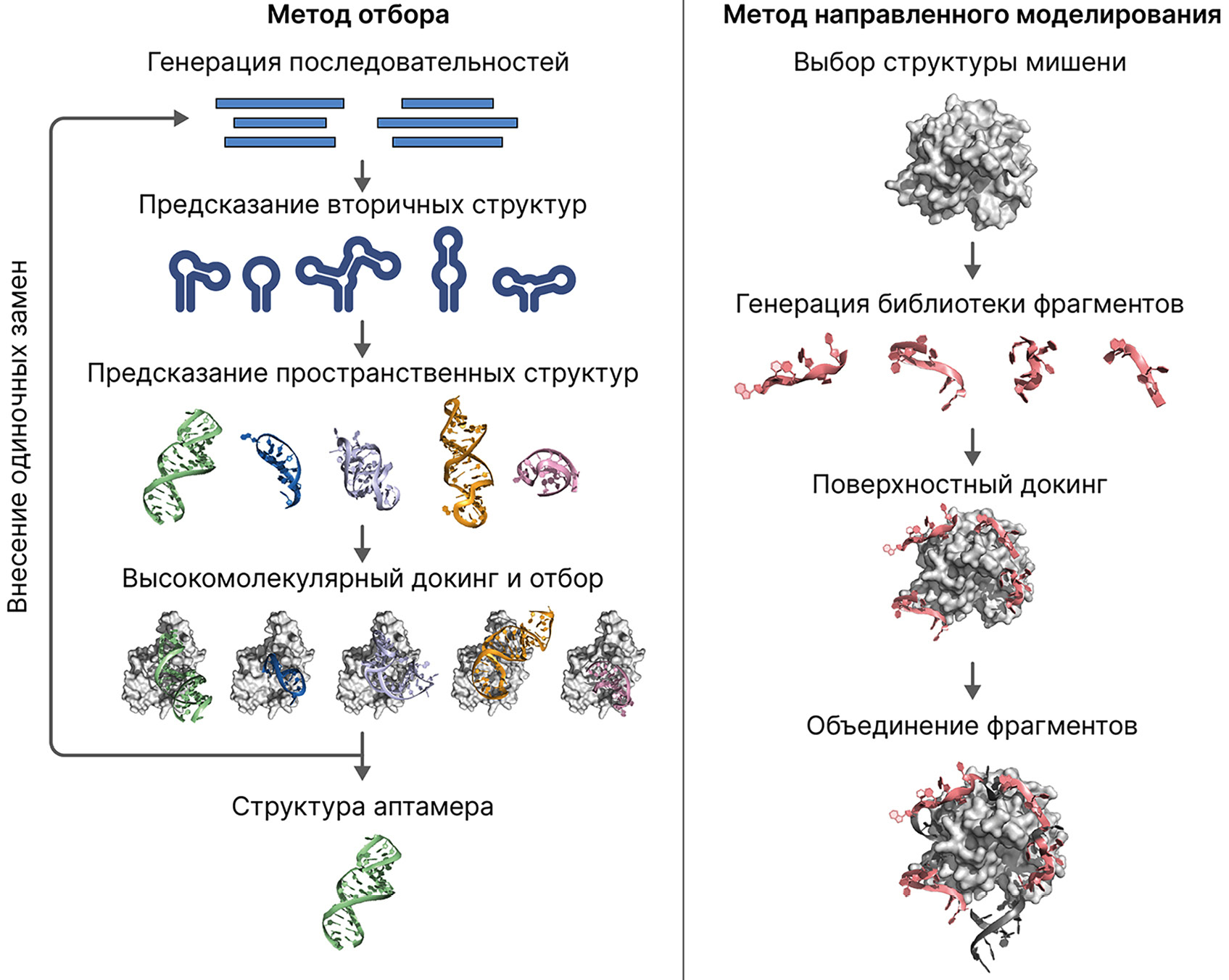 Таким образом, существует два перспективных направления развития методов молекулярного моделирования аптамеров на основе структуры мишени. Одна группа методов имитирует процесс отбора, характерного для SELEX, с использованием предсказания пространственной структуры, докинга и молекулярной динамики, вторая производит направленную разработку структуры нуклеиновой кислоты, способную связываться с эпитопом на поверхности белка. Общая схема применения данных подходов показана на рис. 6. Оба подхода требуют качественного предсказания вторичной и третичной структуры, а также использования методов молекулярной динамики. Развитие данных методов является наиболее важным для успешного прогнозирования новых аптамеров.