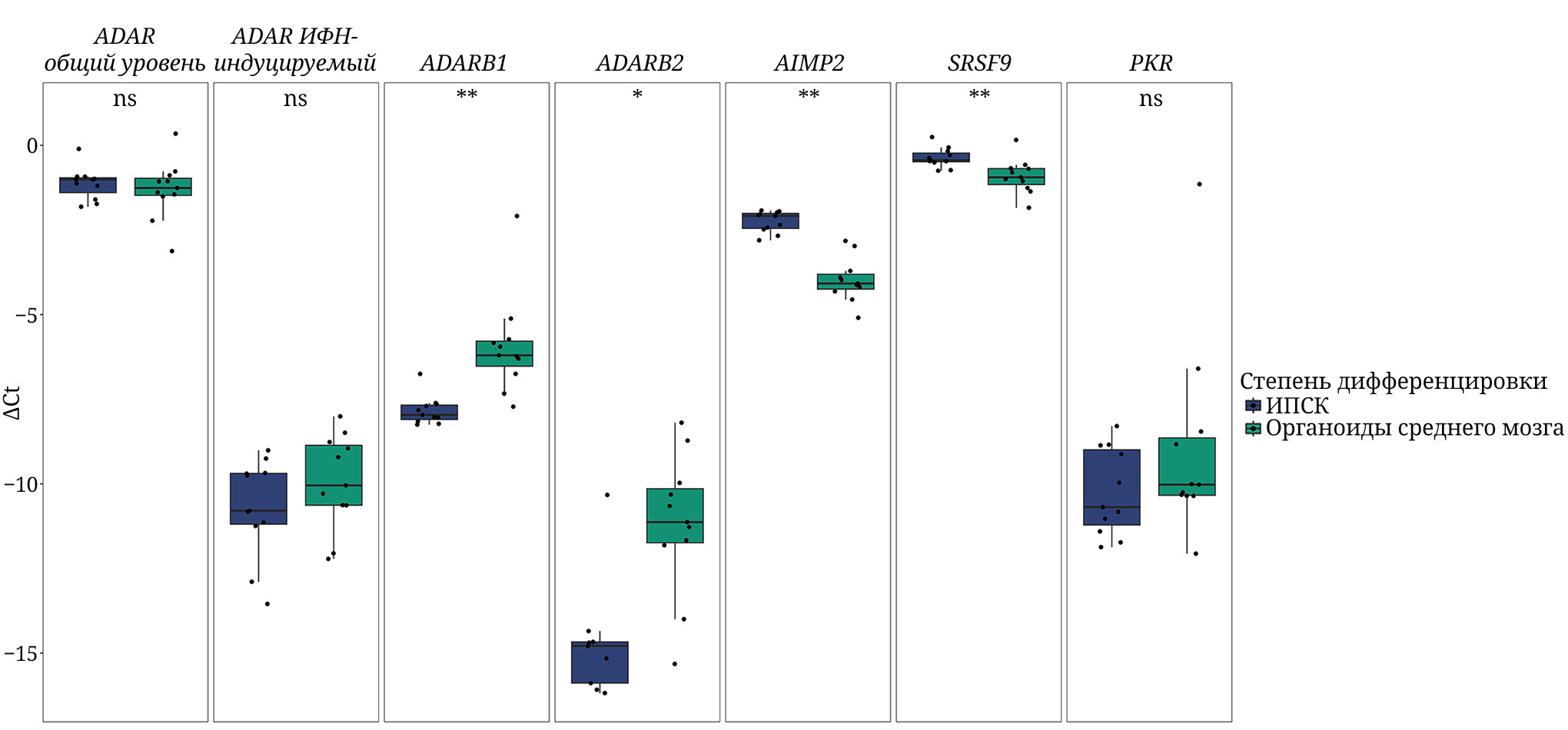 Рис. 2. Анализ дифференциальной экспрессии связанных с системой ADAR генов при сравнении ИПСК и органоидов среднего мозга. ΔCt – разница между пороговым циклом исследуемого гена и средним геометрическим пороговых циклов ACTB и TBP; ИФН – интерферон; * p-value < 0,05; ** p-value < 0,01; ns – p-value > 0,05. Более подробно данные представлены в табл. П3Б в Приложении